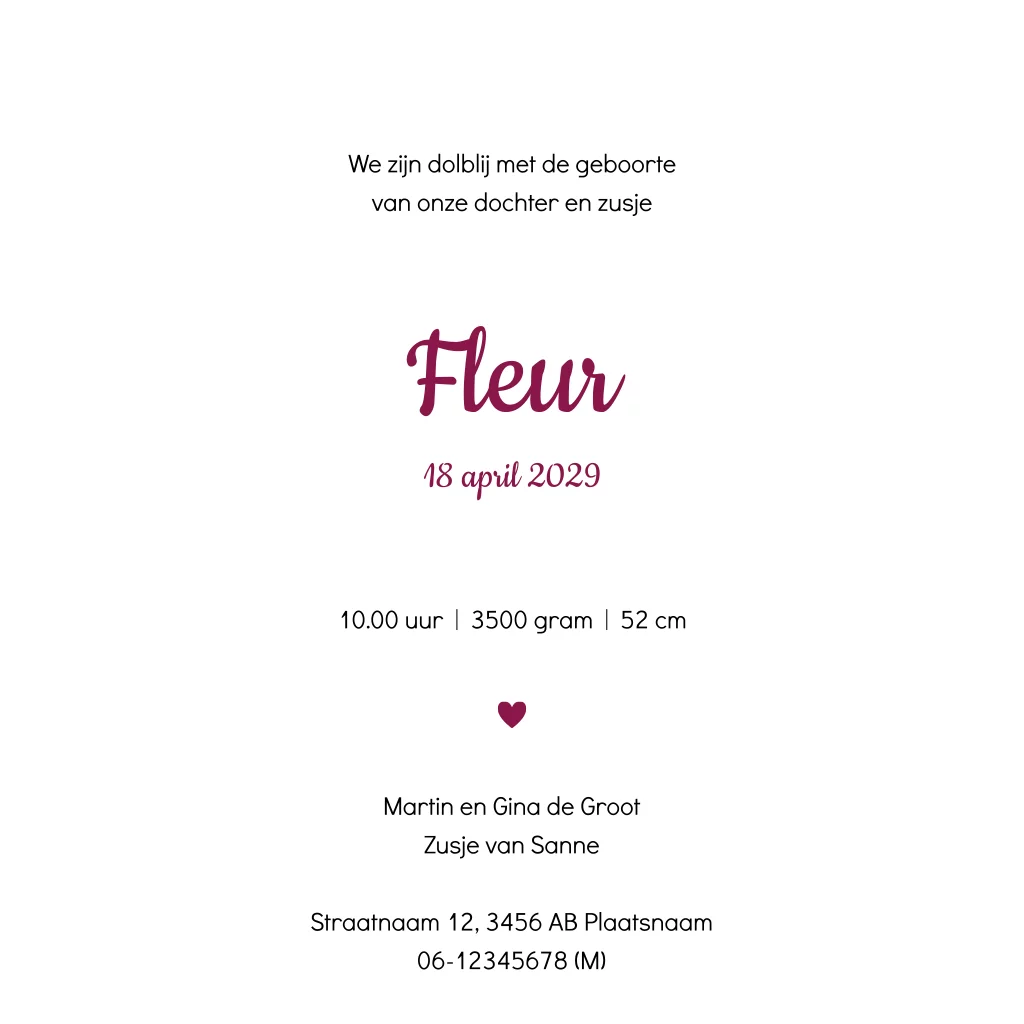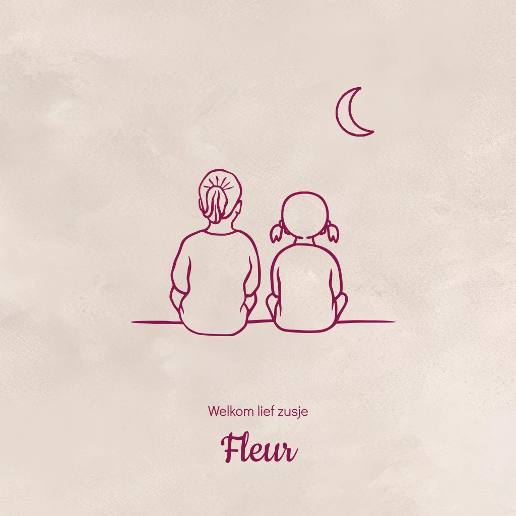 Lief geboortekaartje om de komst van een 2e kindje aan te kondigen met een lijntekening van een grote zus zittend naast haar kleine zusje onder de maan. Je kunt de kleur heel simpel wijzigen met de designtool. Vraag gelijk een proefdruk aan als je klaar bent – zo zie je precies hoe het ontwerp in het echt gedrukt wordt.