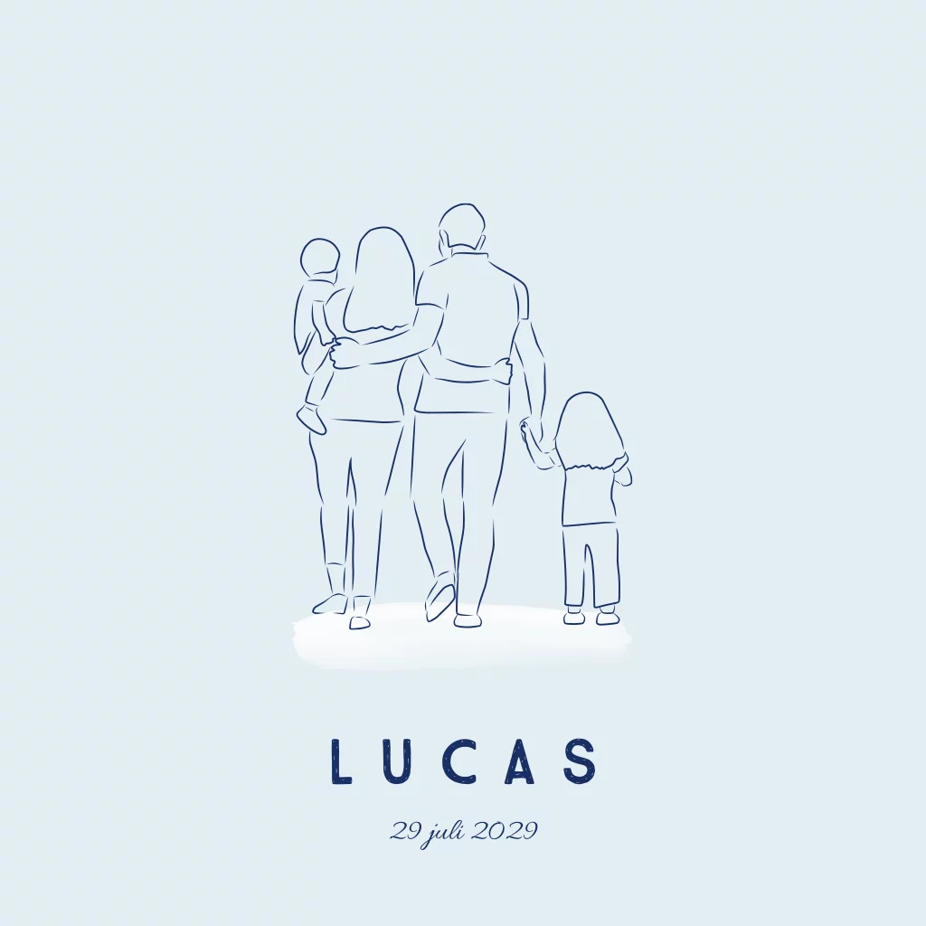 Mooi blauw geboortekaartje voor een 2e kindje en dit keer een jongen. De fijne lijntekening van papa, mama, grote zus en de baby maakt deze illustratie extra persoonlijk. Een tijdloos ontwerp dat rust uitstraalt en bij elke stijl past. Pas het kaartje eenvoudig aan naar jullie wensen in de online editor.