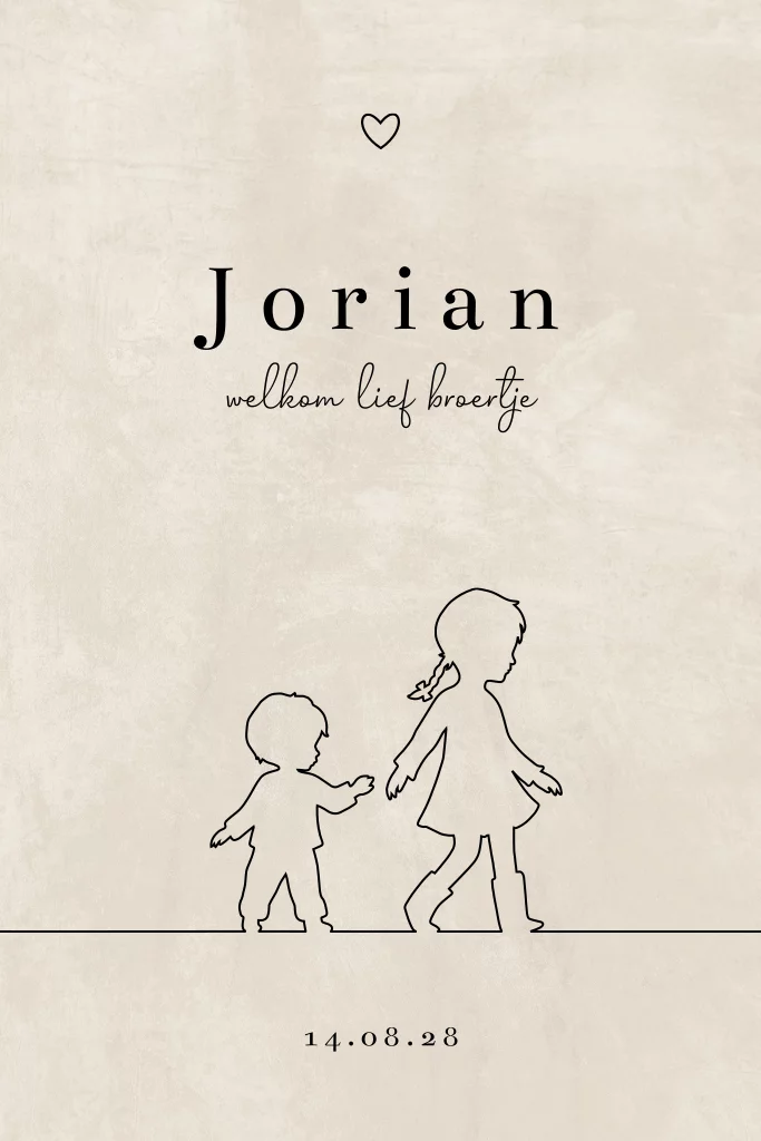 Lief en klassiek geboortekaartje voor een tweede kindje met lijntekeningen van silhouet zus en broertje op een rustige, beige achtergrond. Liever een andere kleur of de achtergrond aanpassen? Geef je eigen draai aan dit geboortekaartje met onze handige ontwerptool.