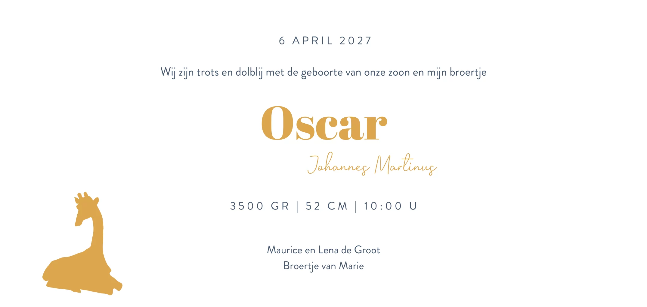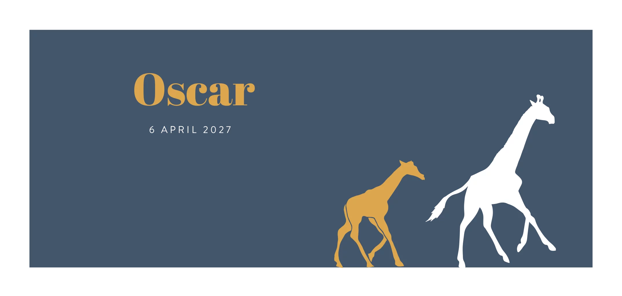 Donkerblauw geboortekaartje voor een 2e kindje met twee giraffen. Hip geboortekaartje met donkerblauwe achtergrond, wit kader en een grote en kleine giraf. De kleinste giraf, symbool voor jullie pasgeboren baby jongen is in een okergele kleur. En nu dit jullie 2e kindje is, is dit helemaal toepasselijk! Met een leuk lettertype staat de naam van jullie zoon voorop de kaart. Pas de kaart zelf in een paar stappen aan in de ontwerptool.