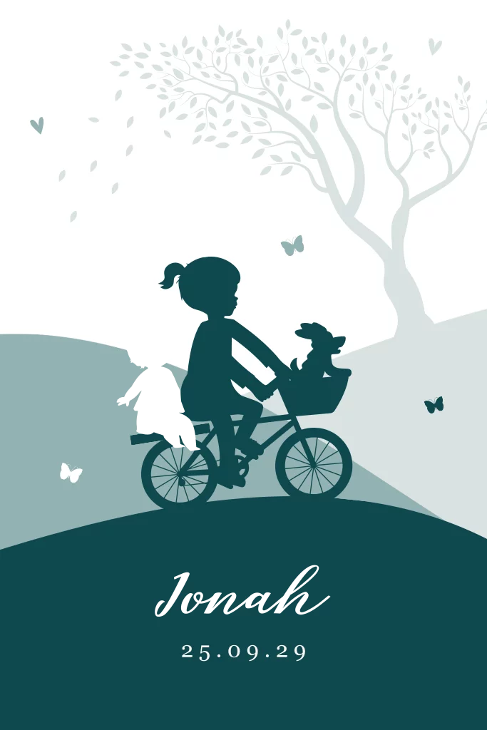 Is er een klein broertje op komst? Geef zijn grote zus een plekje op het geboortekaartje! Op dit lieve ontwerp fietsen een zus en broertje met een hondje in het fietsmandje. Ze fietsen door een groenblauw landschap met een boom en kleine vlindertjes. De kaart wordt extra speciaal door de prachtige goudfolie en de afgeronde hoeken. Pas dit kaartje zelf aan in onze ontwerptool en bestel een proefdruk.