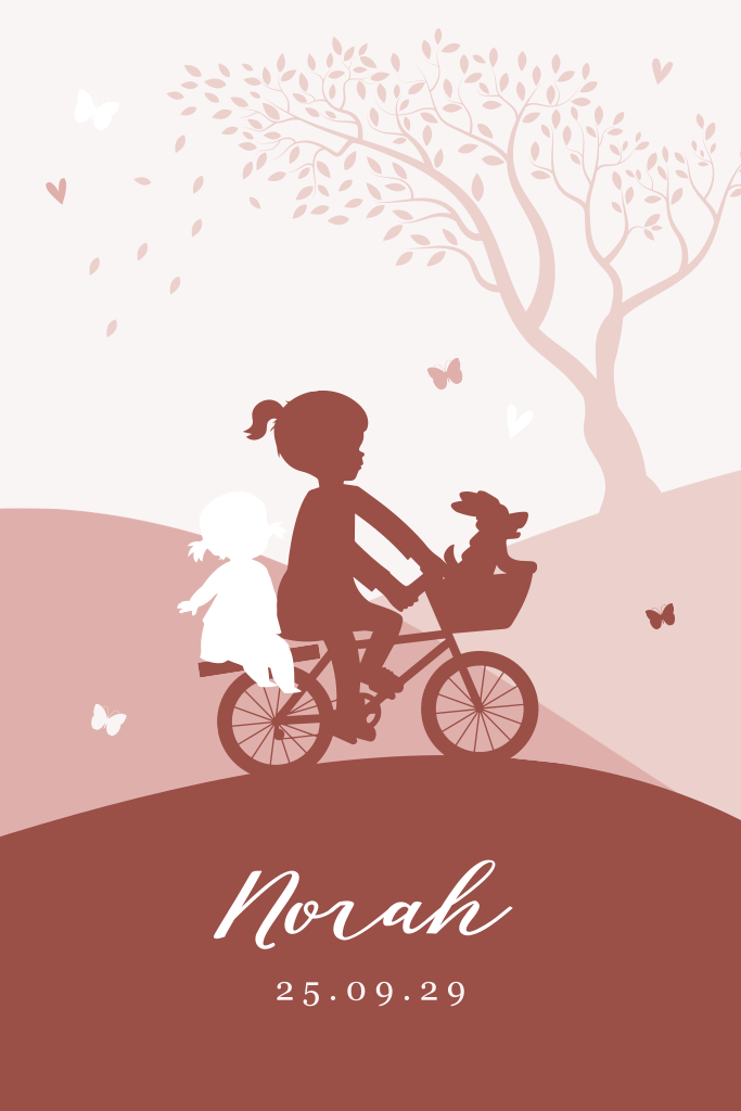 Is er een klein zusje op komst? Geef haar grote zus een plekje op het geboortekaartje! Op dit lieve ontwerp fietsen twee zusjes met een hondje in het fietsmandje. Ze fietsen door een roze landschap met een boom en kleine vlindertjes. De kaart wordt extra speciaal door de prachtige roségoudfolie en de afgeronde hoeken. Pas dit kaartje zelf aan in onze ontwerptool en bestel een proefdruk.