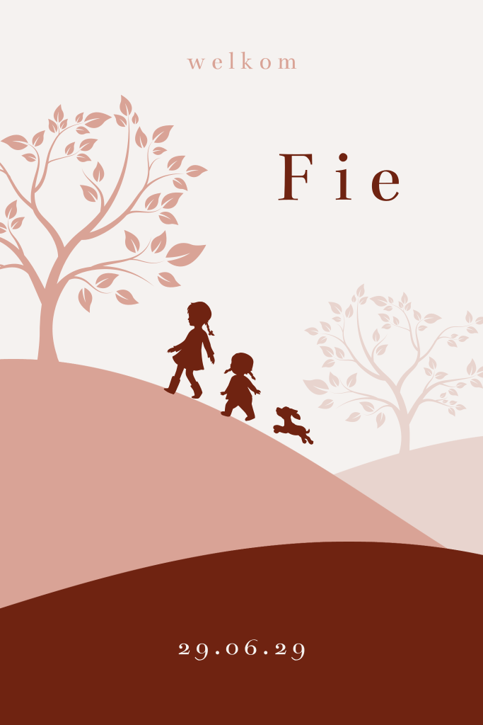 Lief geboortekaartje in roze tinten voor een tweede kindje. Kondig de komst van je dochtertje aan met dit silhouet geboortekaartje met rennend meisje en haar grote zus in een landschap vol heuvels en bomen. Een klein hondje rent vrolijk achter hen aan. Pas zelf de kleuren of lettertypes aan in onze editor en bestel een proefdrukje.