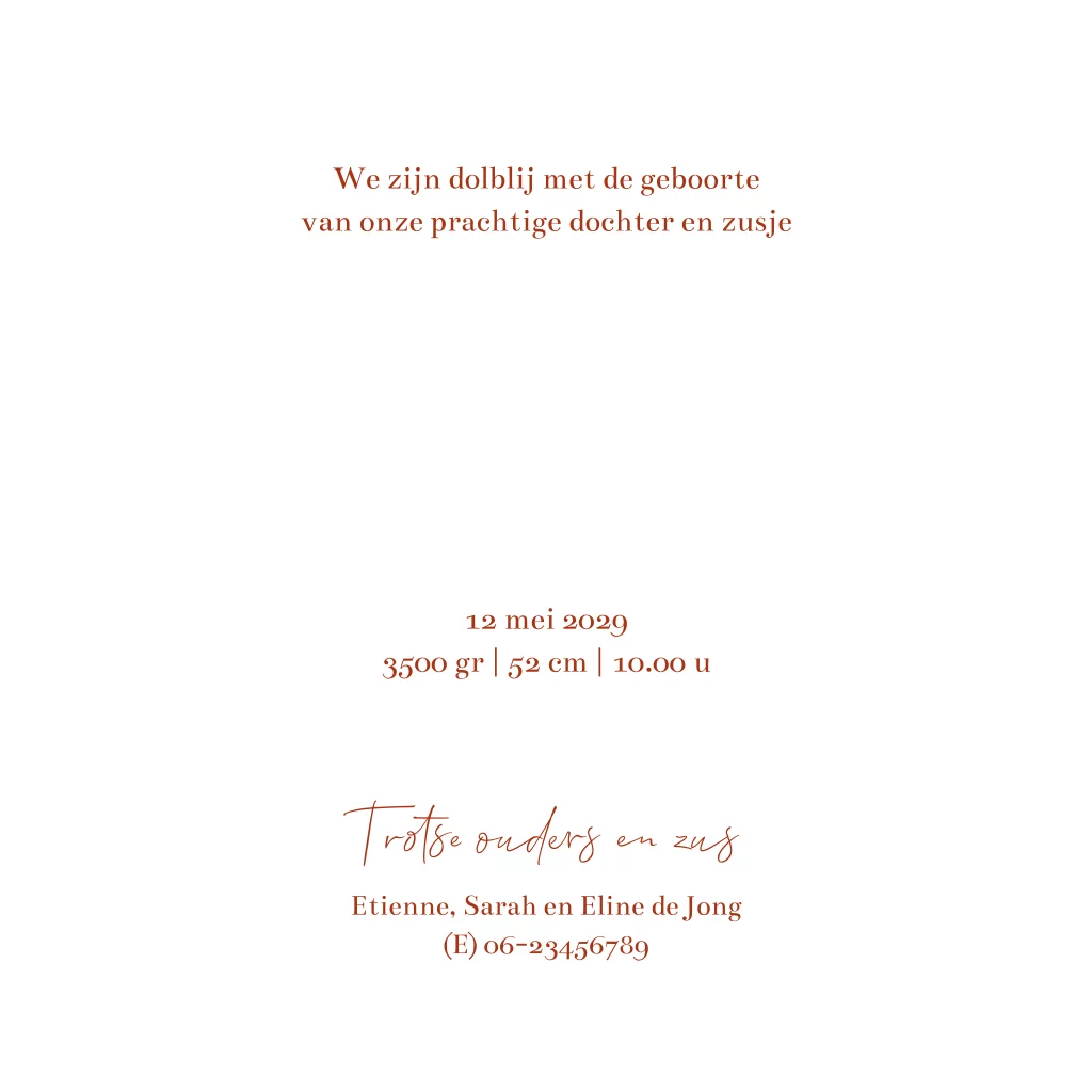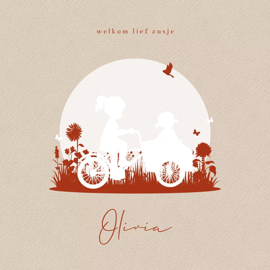 Een ontzettend lief geboortekaartje voor als er een 2e kindje op komst is, en wel een klein zusje. De grote zus bestuurt de bakfiets waar zij in zit door een veld vol bloemen en vlinders. De warme kleuren zijn helemaal van nu! Zeker in combinatie met het glimmende roségoudfolie. Toch liever andere tinten? Pas gemakkelijk de kleuren aan van dit geboortekaartje in onze editor.