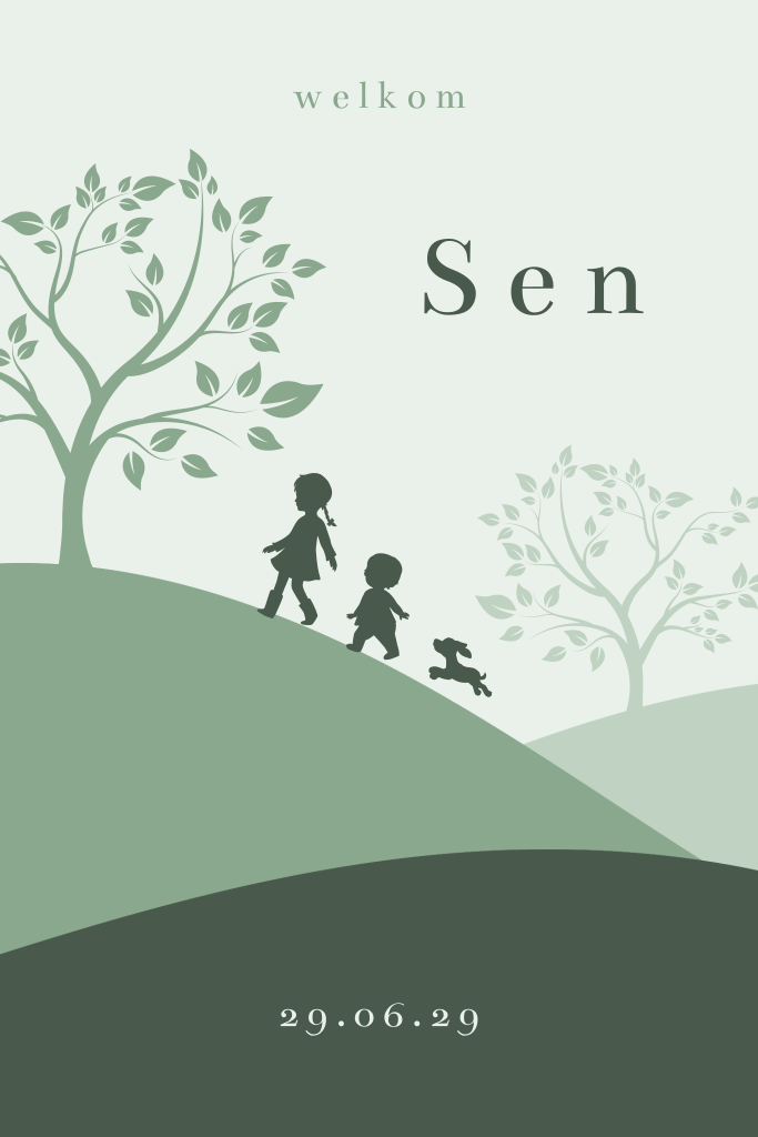 Lief geboortekaartje in groene tinten voor een tweede kindje. Kondig de komst van je zoontje aan met dit silhouet geboortekaartje met rennend jongetje en zijn grote zus in een landschap vol heuvels en bomen. Een klein hondje rent vrolijk achter hen aan. Pas zelf de kleuren of lettertypes aan in onze editor en bestel een proefdrukje.