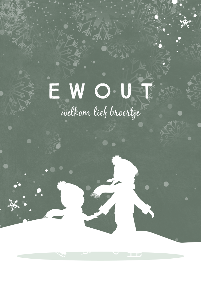 Leuk, groen geboortekaartje met winters thema voor een tweede kindje. Voorop schaatsen een klein silhouet jongetje en zijn grote zus in prachtig, glimmend goudfolie. Sneeuwvlokjes dwarrelen om hen heen en ook de naam van je tweede kindje komt in glinsterend folie op dit winterse ontwerp te staan. Kondig de komst van je winterkindje aan in stijl! Een ander lettertype of de silhouetjes aanpassen? Geef je eigen creatieve draai aan dit lieve ontwerp met behulp van onze handige editor. Bestel een proefdruk om het resultaat in het echt te kunnen zien.