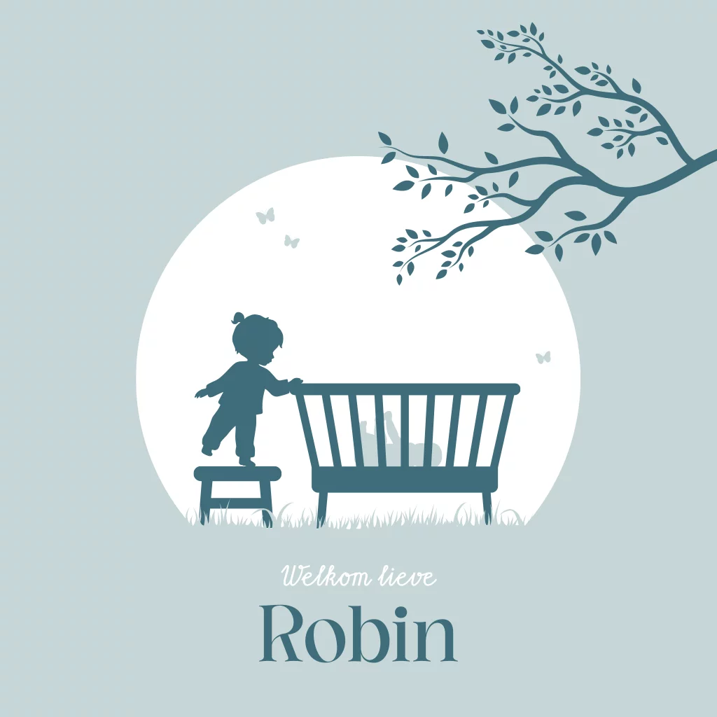 Silhouet geboortekaartje voor de geboorte van een tweede kind, dit keer een jongen. Er staat een wiegje in het gras met daarin de pasgeboren zoon, het zusje kijkt nieuwsgierig over het randje van de wieg. Pas het geboortekaartje naar eigen inzicht aan in de tool.