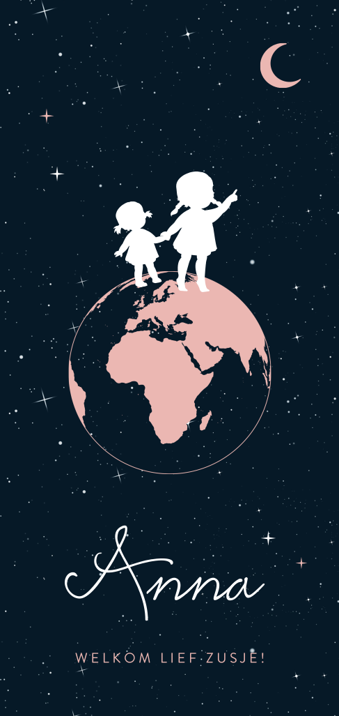 Ben je zwanger van een tweede kindje en dit keer weer een meisje? Dan is dit geboortekaartje met silhouette oudste zus en haar baby zusje op wereld wijzend naar de maan superleuk en toepasselijk. Niet alleen de silhouetjes zijn superhip maar ook de maan en sterren zijn helemaal van nu. Je kunt de kaart zelf eenvoudig bewerken in de designtool.
