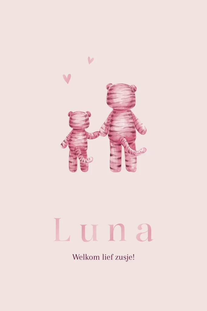 Geboortekaartje met twee roze tijgertjes: grote zus met zusje