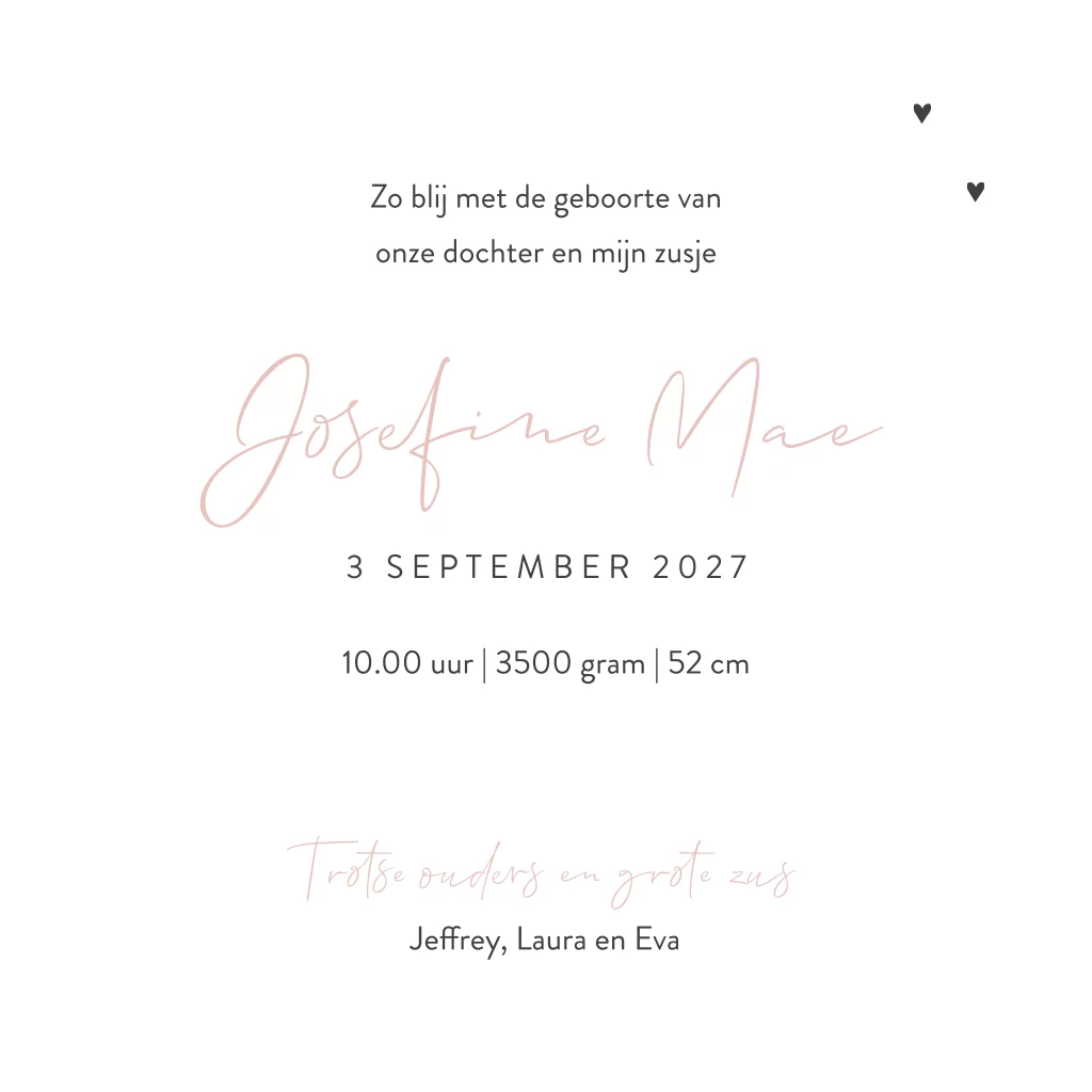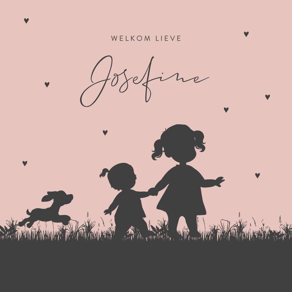 Lief geboortekaartje met silhouet van een grote zus die trots hand in hand loopt met haar kleine zusje. Een mooi ontwerp passend bij jullie gezinnetje om de komst van jullie dochtertje te vieren. Pas het kaartje eenvoudig aan in onze editor en bestel een proefdruk om te zien hoe mooi het resultaat is.