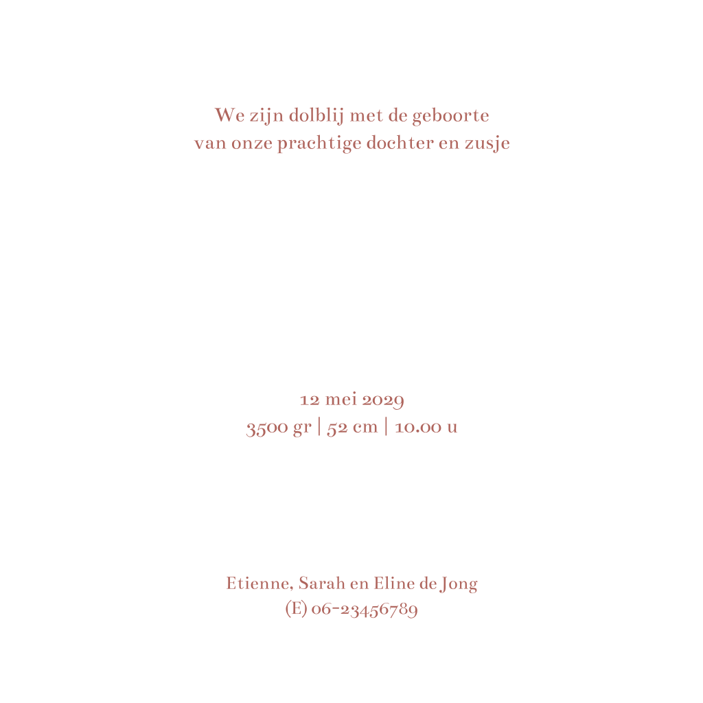 Is er een tweede kindje op komst? Kondig haar geboorte aan met dit leuke geboortekaartje met baby, grote zus en hondje op een skelter. Ze rijden door een landschap met een boom en kleine vlindertjes. Liever een kat? Kijk eens in onze uitgebreide editor voor meer silhouetjes. Ook de kleuren kun je zelf eenvoudig wijzigen. De naam van je dochtertje komt in goudfolie letters onder de silhouetjes.