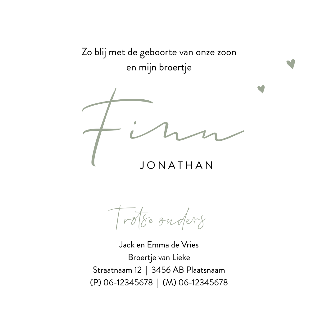 Lief geboortekaartje 2e kindje met lijntekening van twee olifantjes die achter elkaar lopen. Op de zachtgroene achtergrond komt de witte tekening goed naar voren. De kleinste olifant houdt de staart vast met z'n slurf. Aan de binnenzijde staat een soortgelijke illustratie van een klokje, gewichtje en liniaal. Eronder kun je de geboortegegevens van je kindje plaatsen.
