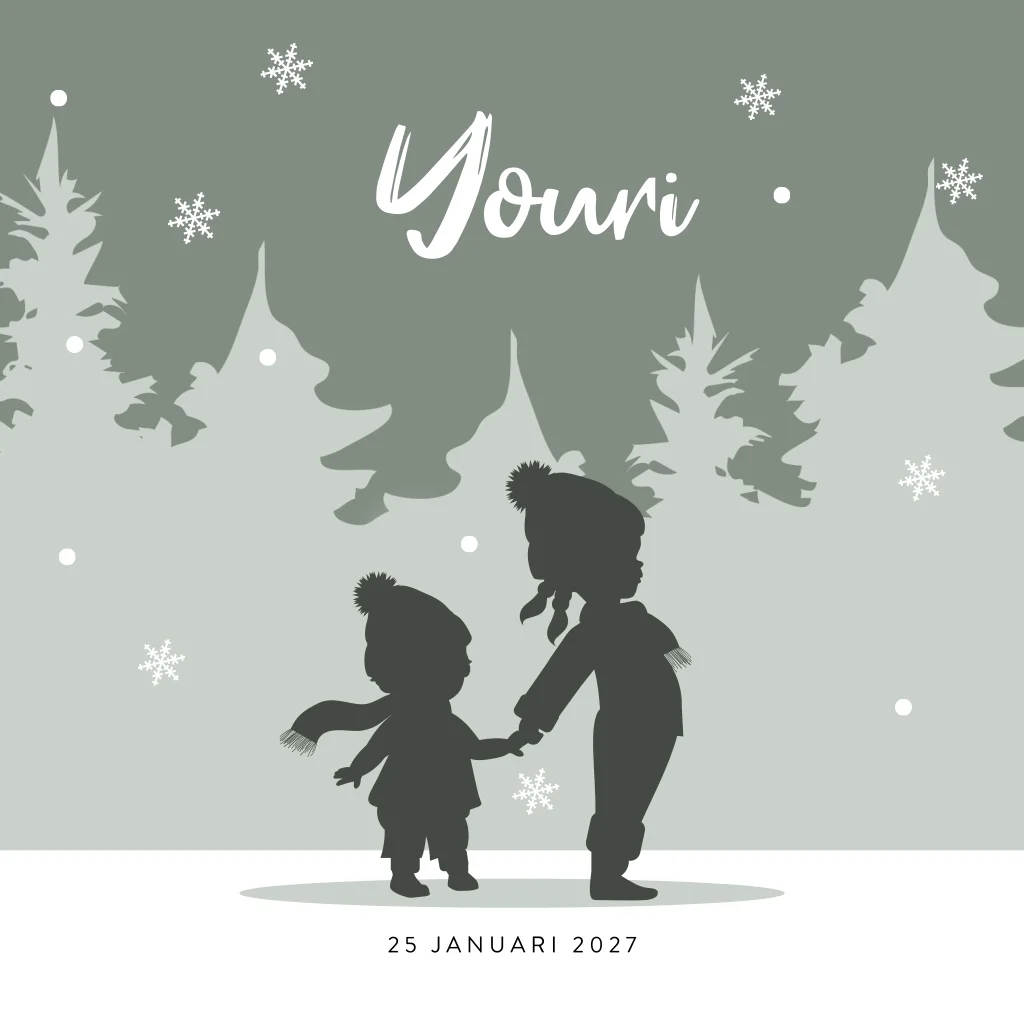Lief geboortekaartje voor de geboorte van je tweede kindje. Voorop zie je een silhouette van een grote zus en haar kleine baby broertje hand in hand in een winters landschap. De grijsgroene kleur is helemaal van nu. Toch liever een andere kleur? Dat kan, pas de kleuren aan in de ontwerptool. Tevreden met je kaartje? Bestel een drukproef om het gedrukte resultaat te bekijken.