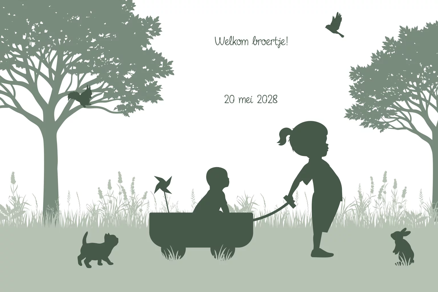 Groen geboortekaartje met grote zus en baby in kar in natuur