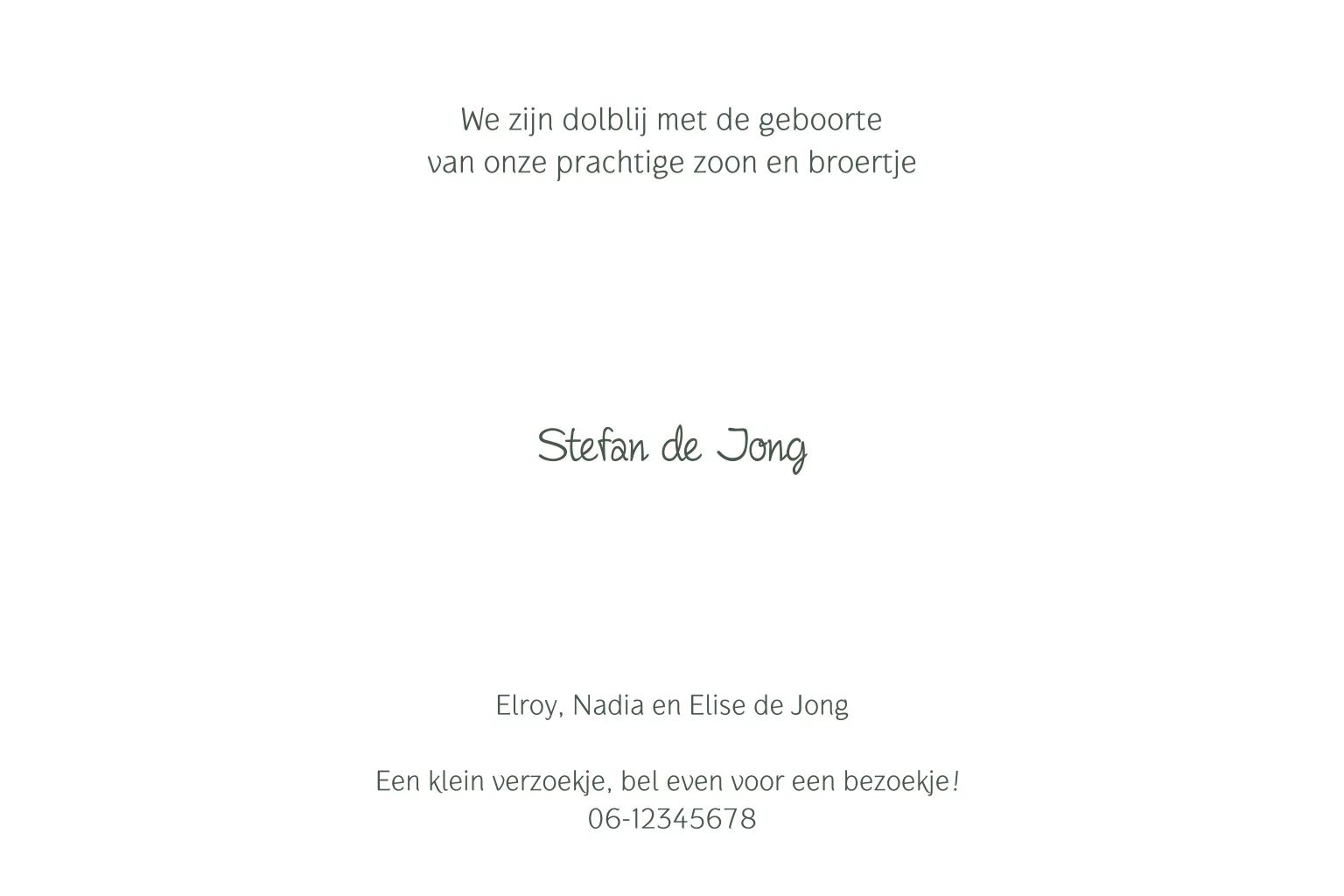 Een stoer geboortekaartje voor een tweede kindje: de grote zus trekt haar kleine zusje in een karretje door het hoge gras. Ze worden vergezeld door een nieuwsgierige kat, een konijntje en fladderende vlinders. In de bomen leeft van alles – kijk maar eens goed. Dit groene geboortekaartje met silhouetten past perfect bij jullie gezin. Pas het ontwerp eenvoudig aan met jullie eigen tekst en kleurkeuze in onze online editor. Een proefdruk thuis ontvangen? Dat is zo geregeld!