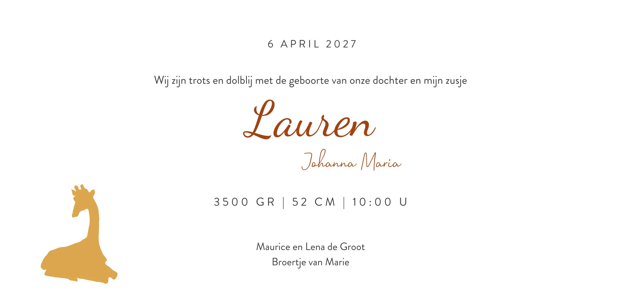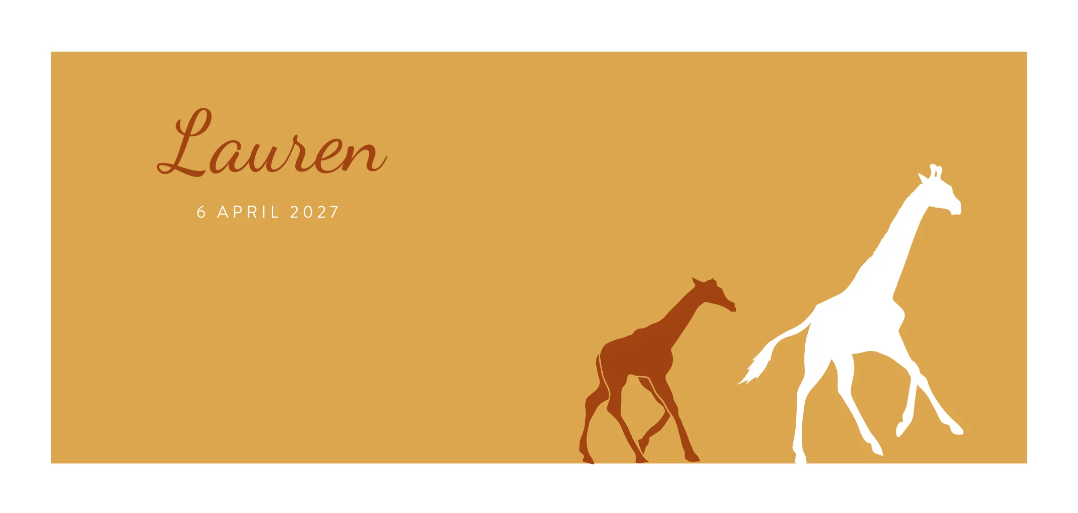 Okergeel geboortekaartje voor een 2e kindje met twee giraffen. Kies dit trendy geboortekaartje met okergele achtergrond, wit kader met een grote en een kleine giraf voor jouw dochter. De kleinste giraf, symbool voor jullie newborn baby is in een roestbruine kleur. En nu dit jullie 2e kindje is, past dit perfect bij jullie gezinssamenstelling! Met een sierlijk lettertype staat de naam van jullie meisje voor op de kaart te schitteren. Je kunt de kaart zelf helemaal aanpassen in de ontwerptool.