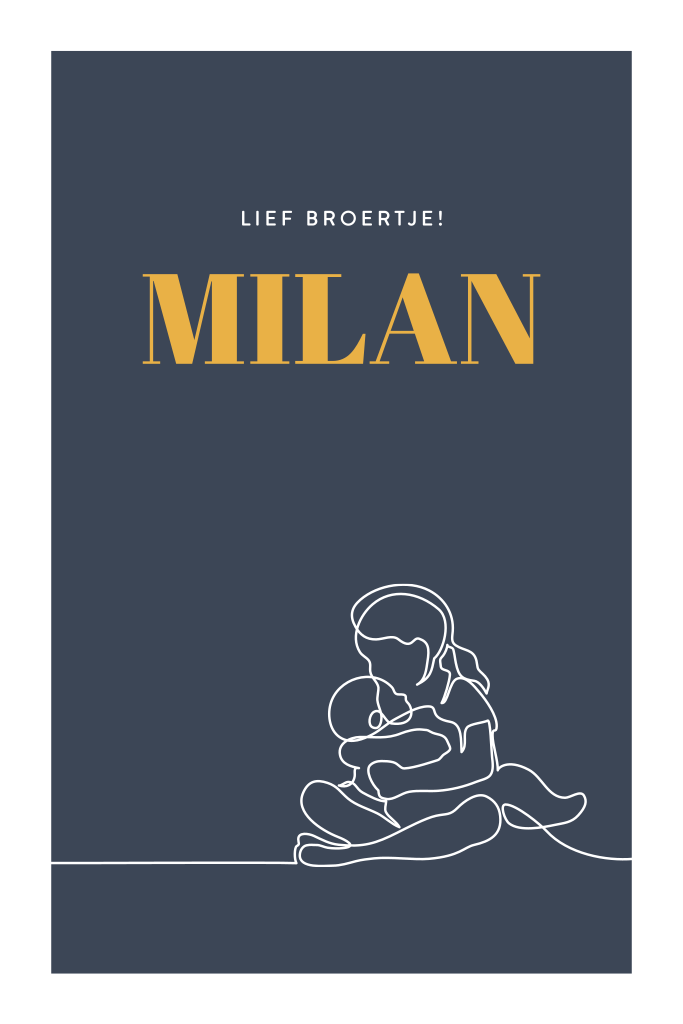 Geboortekaartje met grote zusje en haar baby broertje in monoline illustratie. Prachtig geboortekaartje voor de geboorte van een 2e kindje. Heb je al een dochtertje en is er een jongen op komst? Dan is dit een smaakvol geboortekaartje met een monoline tekening van een grote zus die haar baby broertje in haar armen vasthoudt. In de stoere kleur donkerblauw. Pas zelf de teksten, lettertype en kleuren aan en bestel een drukproef.
