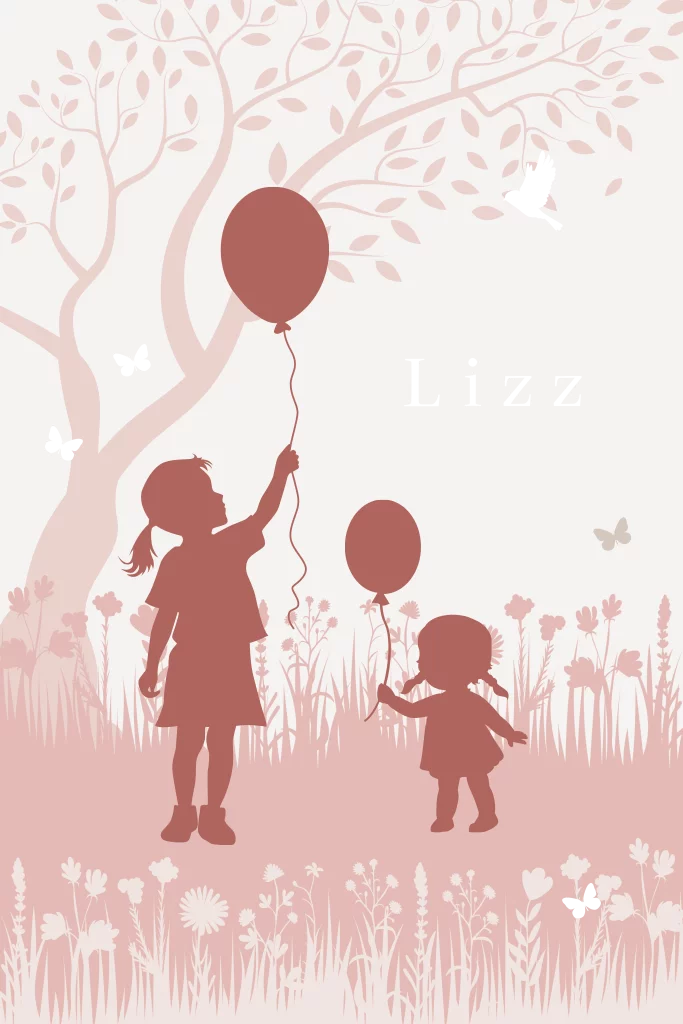 Vier de aankomst van je tweede dochtertje met dit betoverende geboortekaartje. Een schattig ontwerp in roze, waar een twee silhouet zusjes een ballon vasthouden, omringd door bloemen, vlinders en een vogeltje. Perfect voor een klein zusje dat geboren wordt in de lente of zomer! De naam van je kleine, plus vlinders en vogel, worden in prachtig goudfolie gedrukt. Vrolijk, tijdloos en lief, kondig de komst van je tweede kindje aan met dit leuke geboortekaartje! Pas dit ontwerp zelf aan in onze editor en bestel een proefdruk.