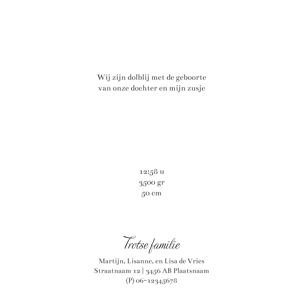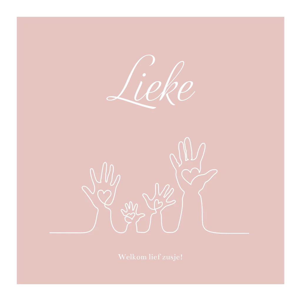 Roze geboortekaartje voor een 2e kindje met vier handen. Is er een tweede kindje op komst? Kies dan voor dit lieve geboortekaartje met vier handen erop voor alle gezinsleden. De illustratie is met één lijn getekend en in de handen zit ook nog een lief hartje. Zo horen jullie als gezin allemaal bij elkaar. Aan de binnenzijde zie je een illustratie van de oudste zus met haar baby zusje, ook in één lijn getekend. Pas zelf dit toepasselijke geboortekaartje aan.