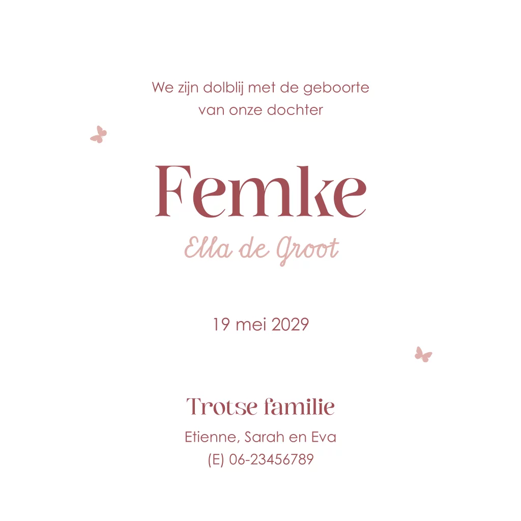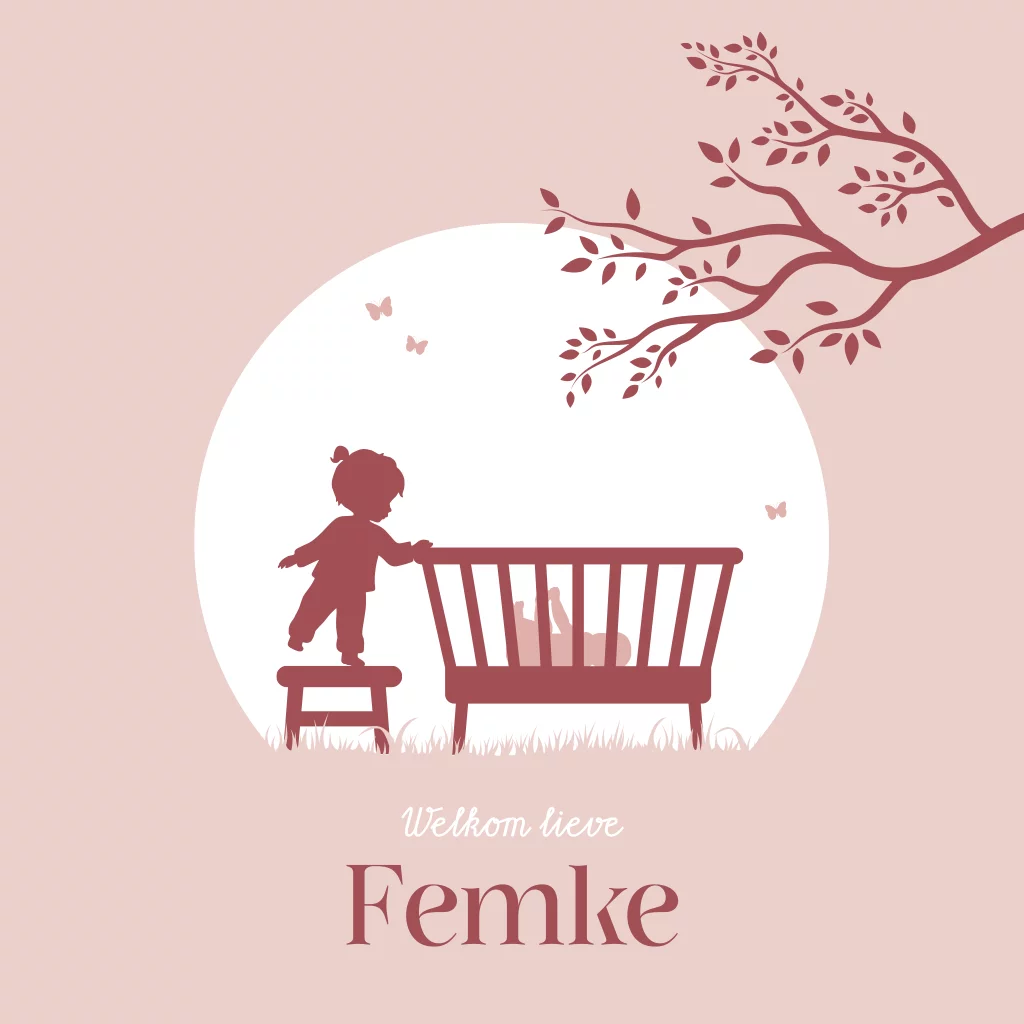 Roze geboortekaartje in silhouet voor de komst van een tweede kindje, dit keer weer een meisje. Bij het wiegje in het gras staat het oudste zusje nieuwsgierig over het randje van de wieg te kijken naar haar kleine babyzusje. Pas het geboortekaartje naar eigen wens aan in de editor.