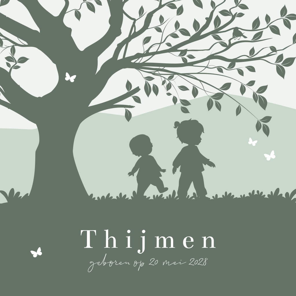 Op zoek naar een leuk geboortekaartje voor een tweede kindje? Ga voor dit lieve silhouet ontwerp met een boom, grote zus en baby jongetje. De naam van je zoontje komt in glimmend goudfolie voorop, evenals de vlindertjes. De kleuren van de illustraties en teksten zijn heel simpel zelf aan te passen in onze ontwerptool. Voeg een eigen foto toe aan de binnenzijde om het kaartje te personaliseren en bestel een proefdruk.