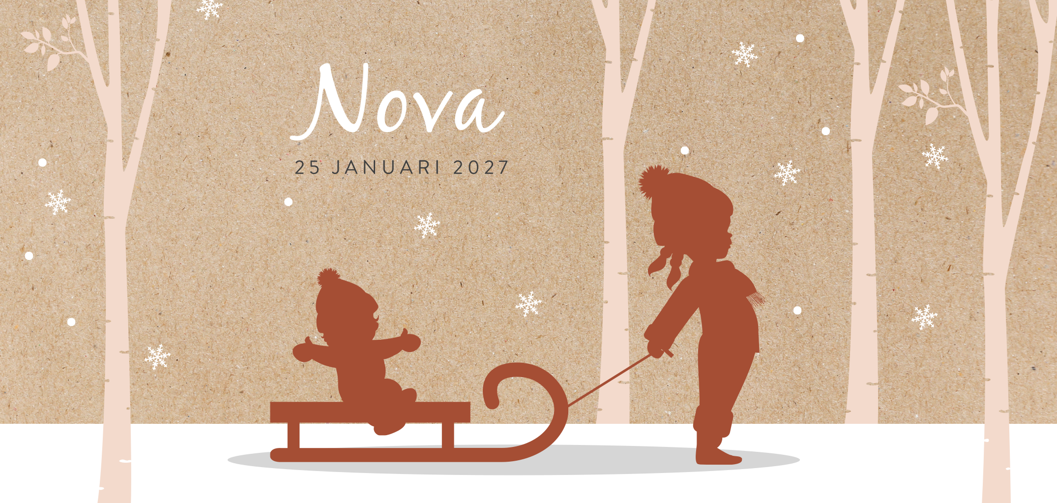 Silhouet geboortekaartje met baby en grote zus op slee in de sneeuw