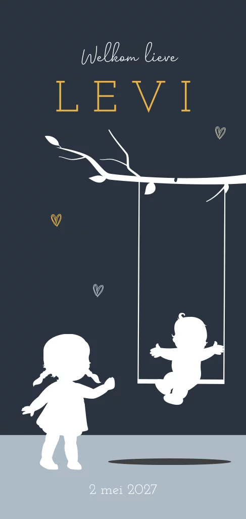 Silhouet geboortekaartje 2e kindje met zusje en baby jongen op schommel. Ben je zwanger van een 2e kindje? Kies dan voor dit trendy donkerblauwe geboortekaartje met baby jongen op een schommel die aan de tak hangt. Naast de schommel staat zijn grote zus. De kaart word opgevrolijkt door de gekleurde hartjes. Wil je een ander lettertype gebruiken? In onze handige ontwerptool kan je het zelf aanpassen. Aan de achterzijde is er genoeg ruimte voor de persoonlijke gegevens van het kindje.
