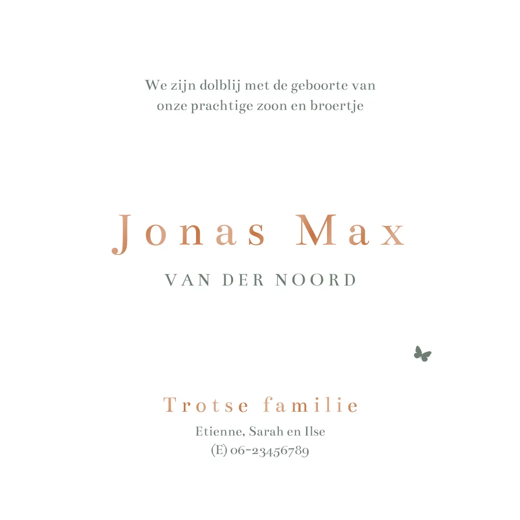 Een schattig ontwerp voor de aankondiging van je tweede kindje: een meisje zit in een veld vol bloemen terwijl haar kleine broertje net aan komt kruipen. Het silhouet van het jongetje en de geboortedatum worden in roestbruin hoogglans gedrukt. Aan de binnenkant van dit vierkante kaartje kun je alle geboortegegevens van je zoon toevoegen. Maak dit geboortekaartje met silhouetjes helemaal naar wens in onze editor en bestel een proefdruk.