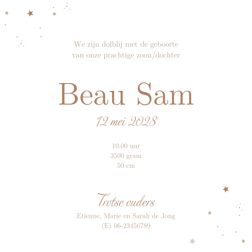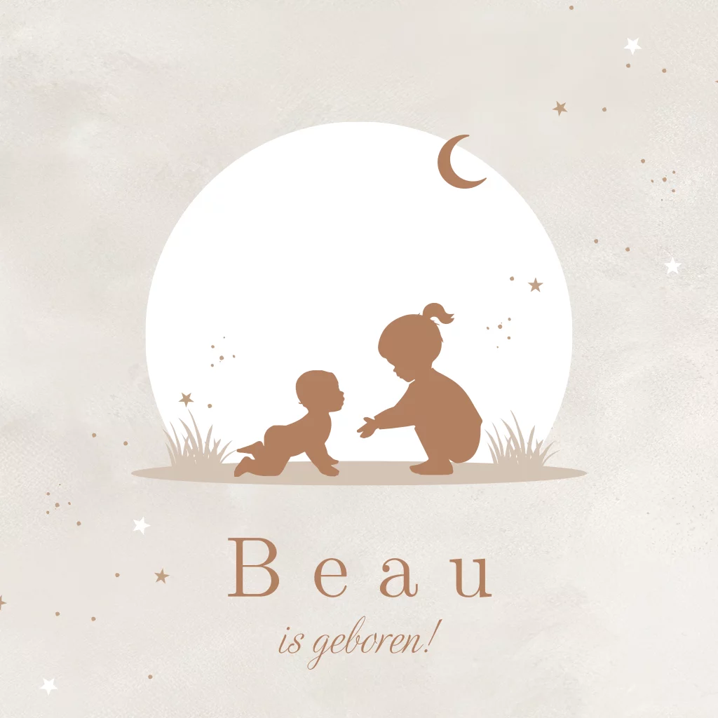Ontdek dit prachtige geboortekaartje met een zachte, tijdloze uitstraling. In het ontwerp zien we een liefdevol silhouet van een grote zus die op haar hurken zit en reikt naar haar pasgeboren broertje of zusje, wat een warme band tussen de kindjes uitstraalt. Het tafereel speelt zich af onder een grote ronde maan met een achtergrond in zachte beigetinten. Het gebruik van neutrale kleuren en een unisex ontwerp maakt dit kaartje geschikt voor zowel een jongen als een meisje. Pas de kaart aan met de handige editor en bestel een drukproef.