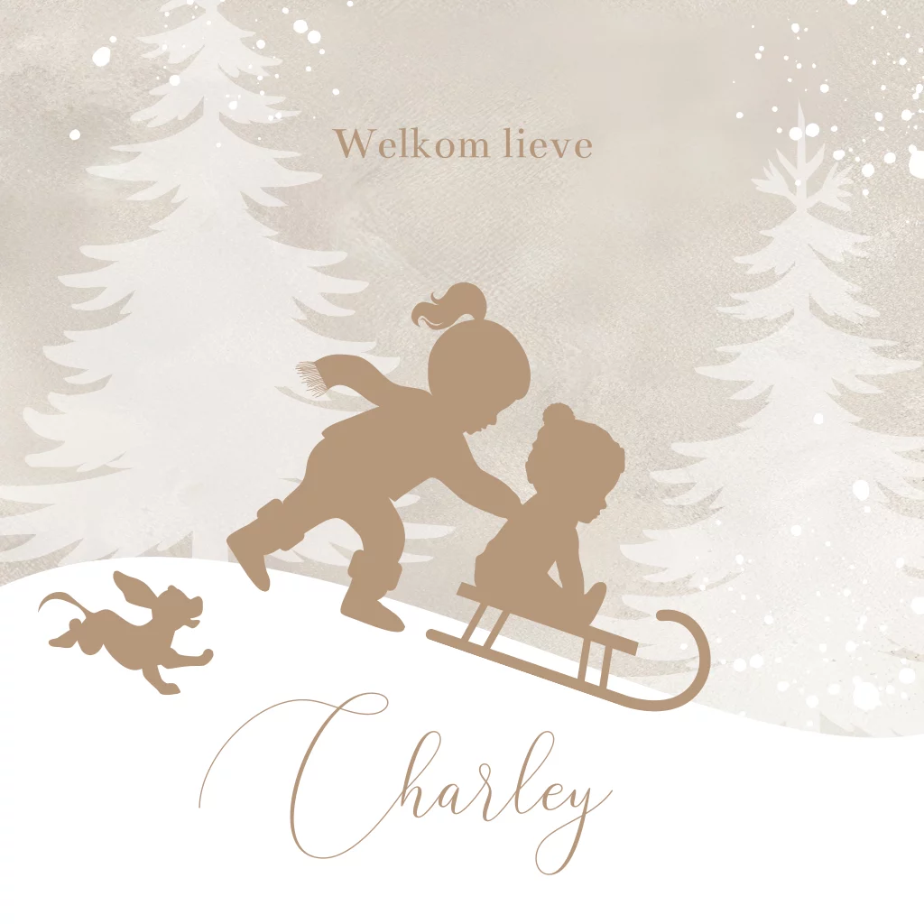 Vier de komst van je kleintje met dit stijlvolle winter geboortekaartje. In het ontwerp duwt een grote zus een slee voort, waar haar pasgeboren broertje of zusje op zit. Omringd door sneeuwvlokken en silhouetten van bomen straalt het kaartje een echte wintersfeer uit. Dankzij de zachte beige tinten is het kaartje geschikt voor zowel jongens als meisjes. Maak het persoonlijk en bestel een proefdruk!