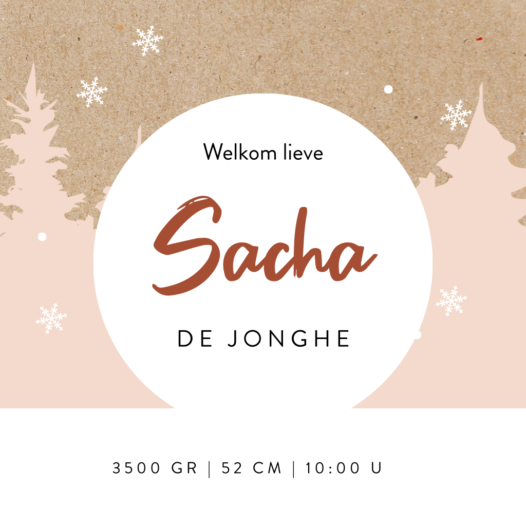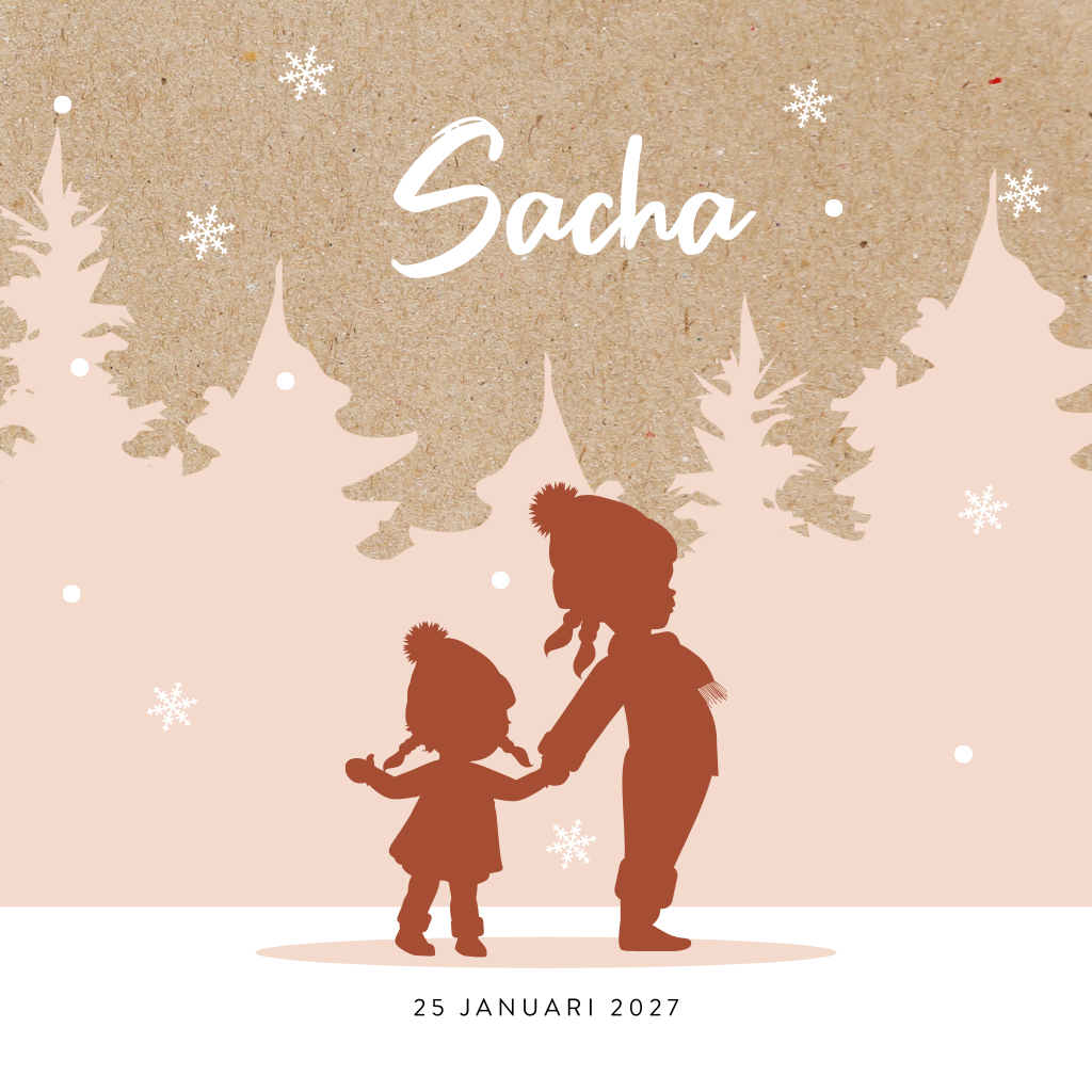 Lief geboortekaartje voor je tweede kindje. Op de voorkant zie je een illustratie van twee zusjes hand in hand in een sneeuwlandschap. Vrolijke sneeuwvlokjes dwarrelen rond het duo. In de kaart keert het meisje terug. Hier is ruimte voor de geboortegegevens en eventueel een lief gedichtje. Pas de lettertypes en kleuren aan om het kaartje te personaliseren.