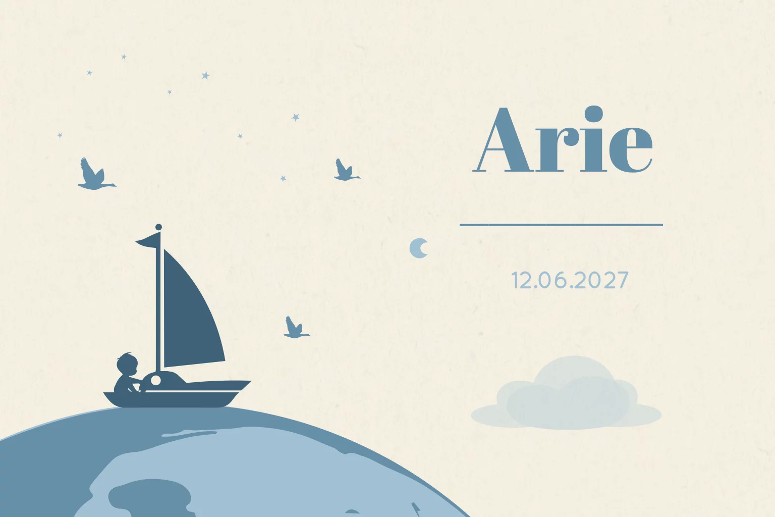 Enkel geboortekaartje met een jongetje dat in zijn zeilboot de wereld overgaat. In stoere blauwtinten en met afgeronde hoeken. Personaliseer de kaart eenvoudig met de editor en bestel een drukproef.