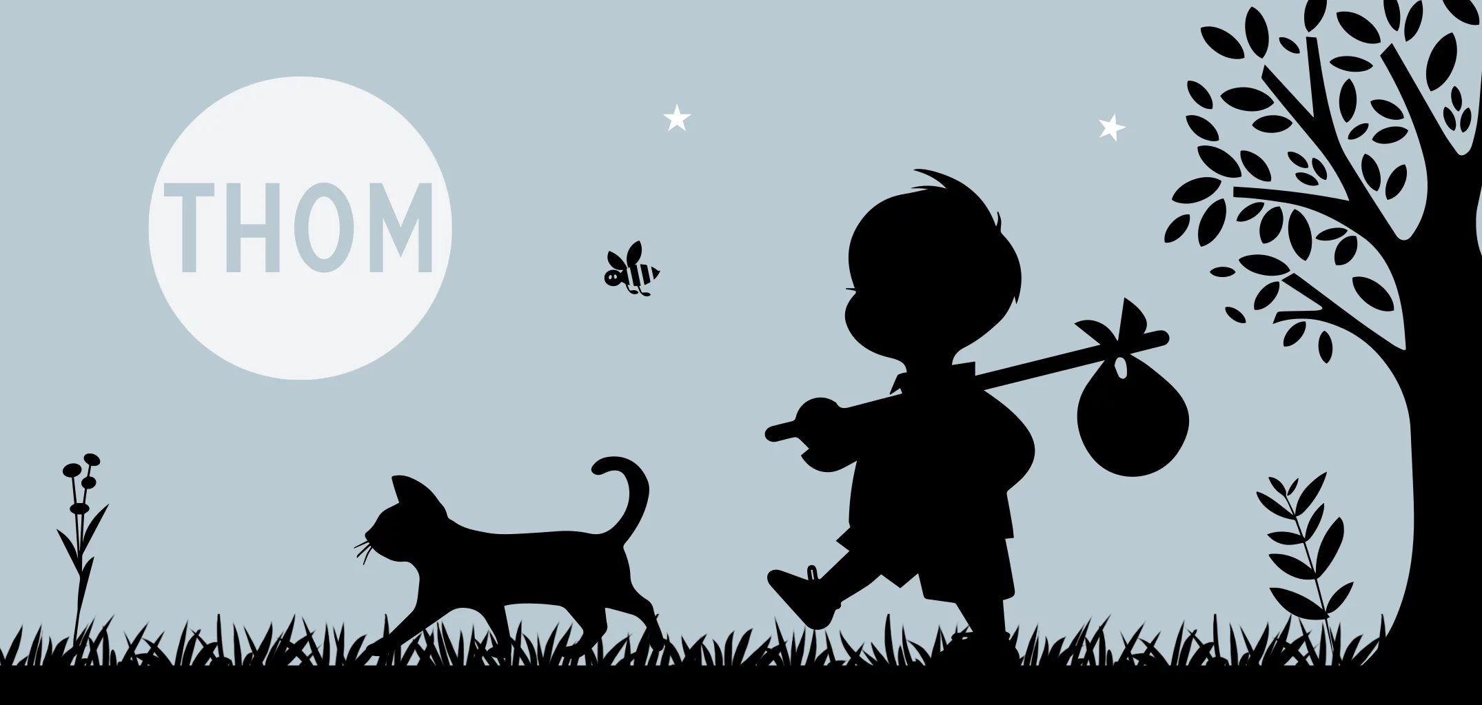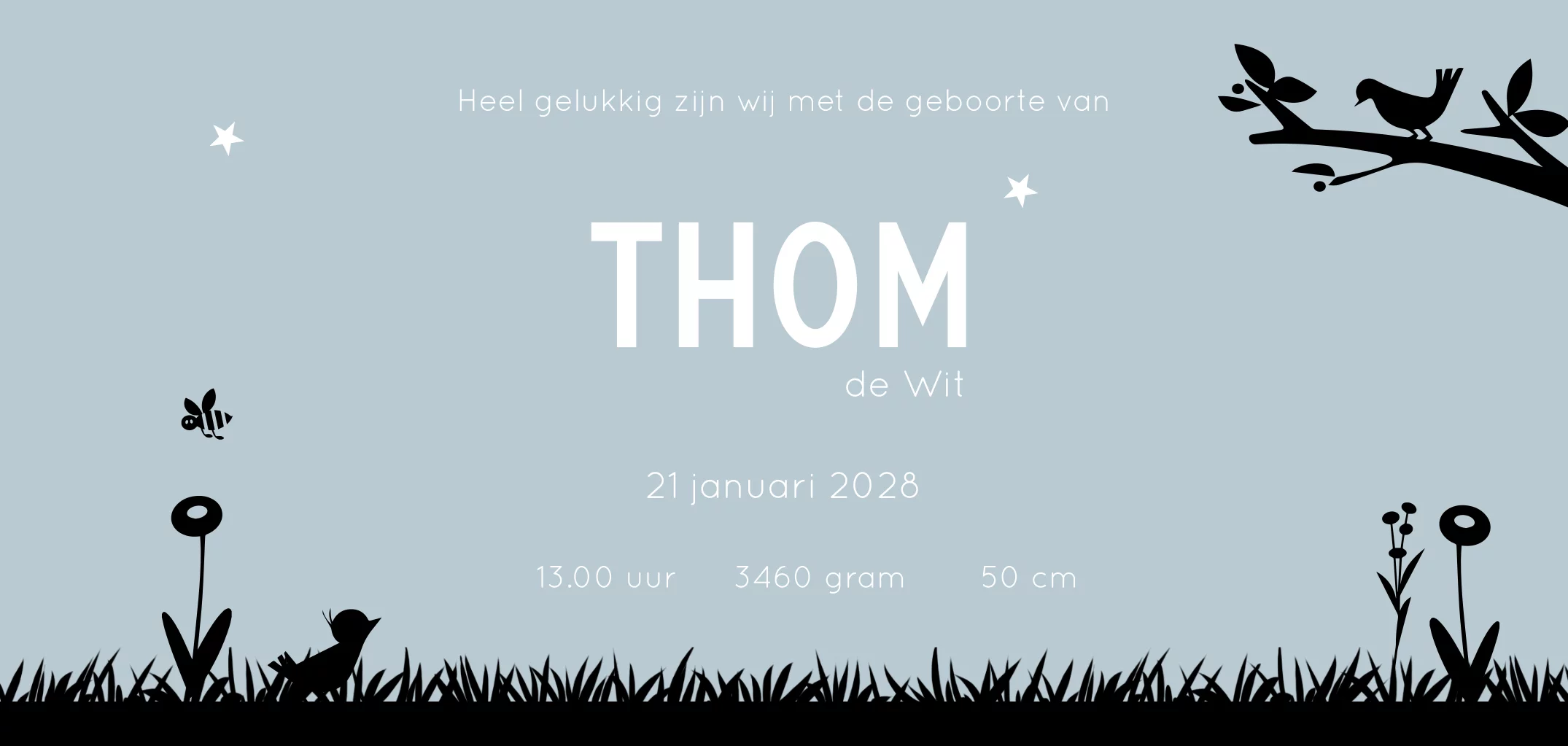 Geboortekaartje waarop een jongetje met een knapzakje op zijn rug samen met zijn kat de wijde wereld in trekt. In de maan staat zijn naam vermeld. Aan de binnenkant van het kaartje zit het jongetje in het gras in wijst naar de kat.