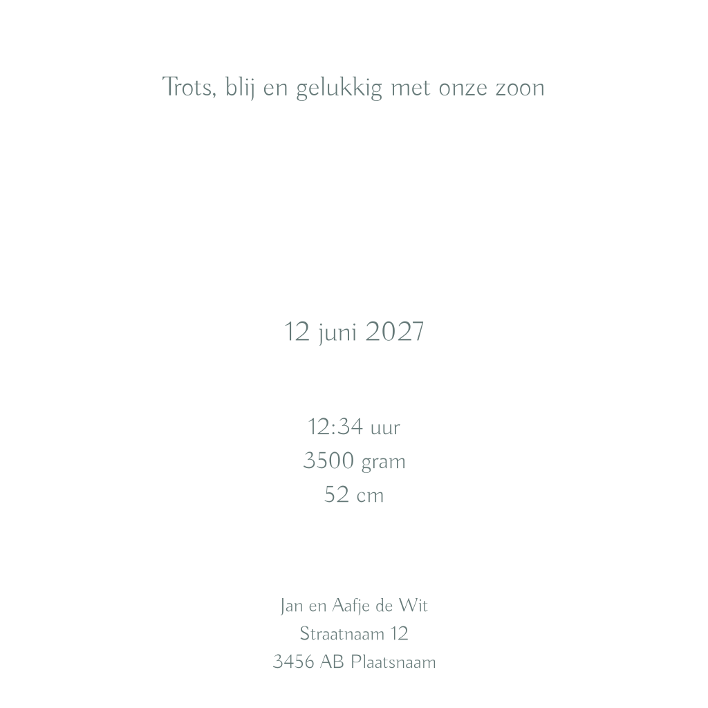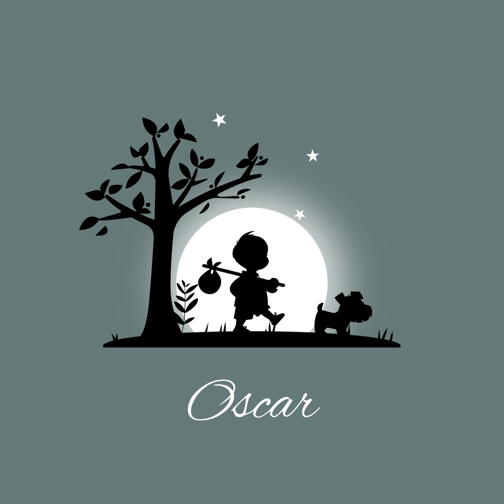 Geboortekaartje waarop een jongetje met een knapzakje op de rug de wijde wereld in trekt. Aan de binnenkant wijst het jongetje naar de sterren. De sterren in de lucht en de naam aan de binnenkant zijn in goudfolie gedrukt.