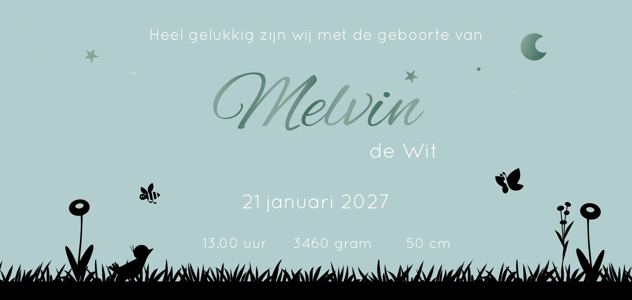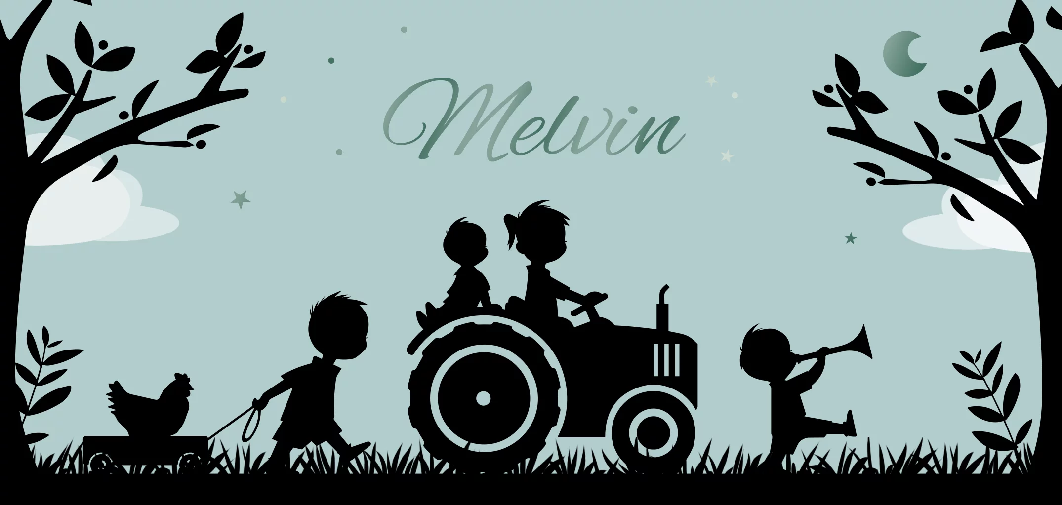 Sfeervol geboortekaartje in een landelijke boerderij-setting. Een klein jongetje wordt meegenomen op de tractor door zijn grote zus. De andere twee kinderen lopen mee. In het gras onder de bomen zorgen kippen, een gans, kat en paard voor een vrolijke noot. de naam en de sterren zijn in prachtig hoogglans gedrukt.