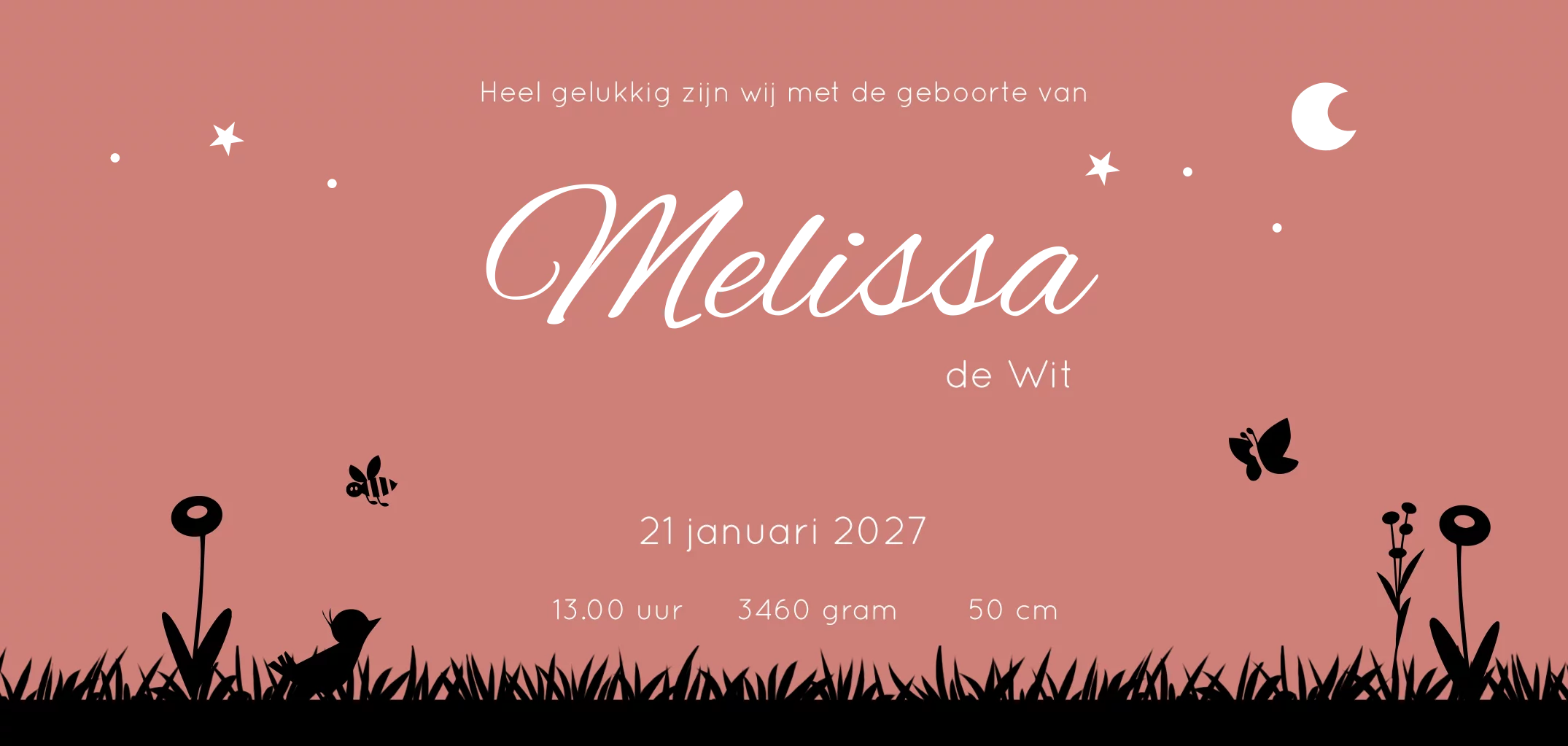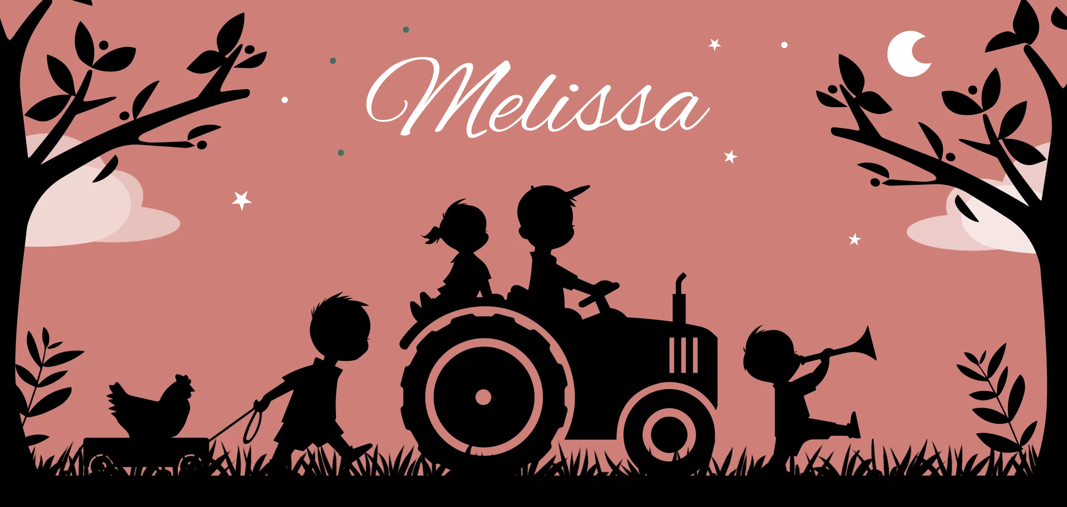 Sfeervol geboortekaartje in een landelijke boerderij-setting. Een klein meisje wordt meegenomen op de tractor door haar grote broer. De andere twee broers lopen mee. In het gras onder de bomen zorgen kippen, een gans, kat en paard voor een vrolijke noot. de naam en de sterren zijn in prachtig hoogglans gedrukt.