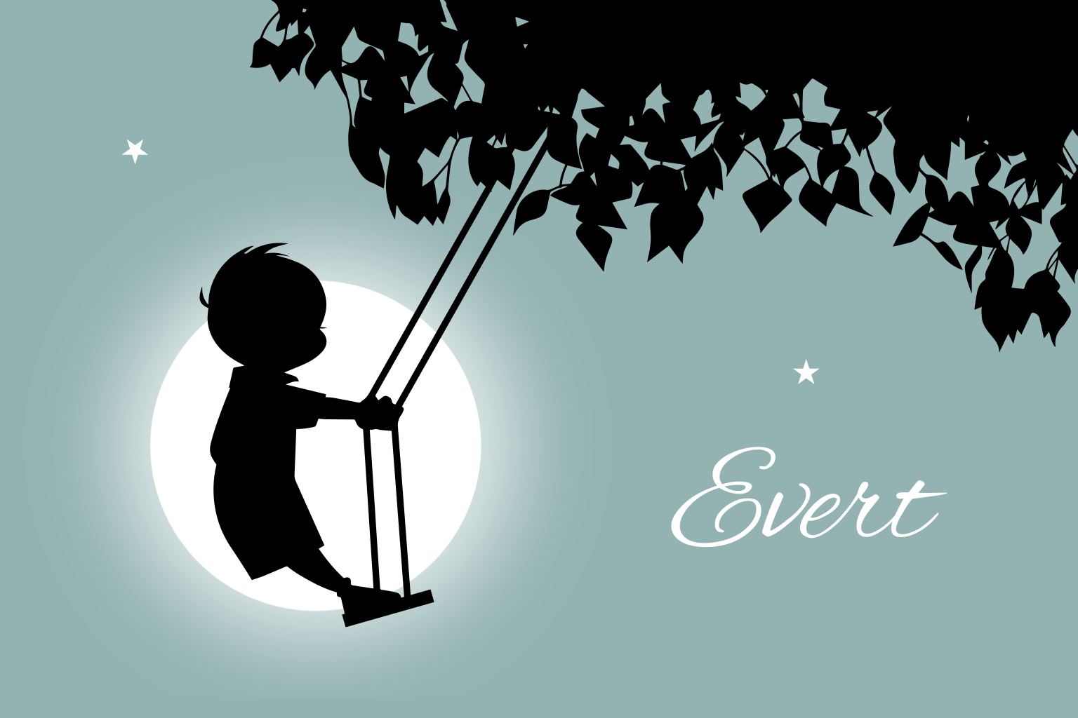Geboortekaartje met het silhouet van een jongetje dat op een schommel staat. Aan de binnenkant vliegen twee vogels met op de achtergrond een stralende zon. Aan de binnenkant is alle ruimte voor de geboortegegevens van jouw kind.