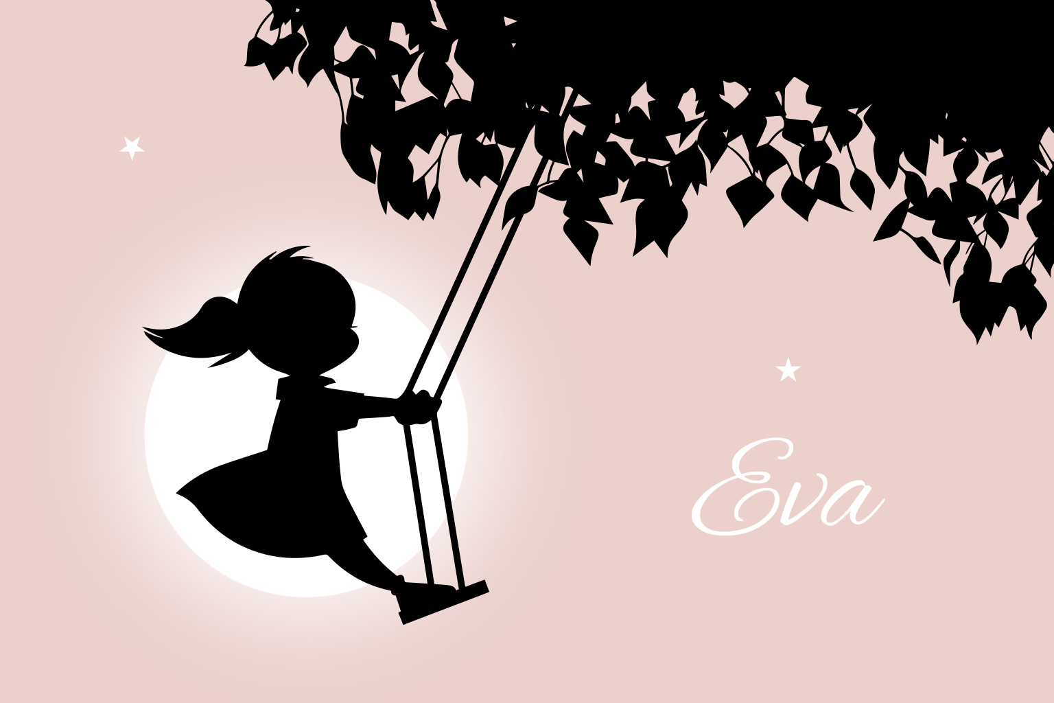 Geboortekaartje met het silhouet van een meisje dat op een schommel staat. Aan de binnenkant vliegen twee vogels met op de achtergrond een stralende zon. Aan de binnenkant is alle ruimte voor de geboortegegevens van jouw kind.