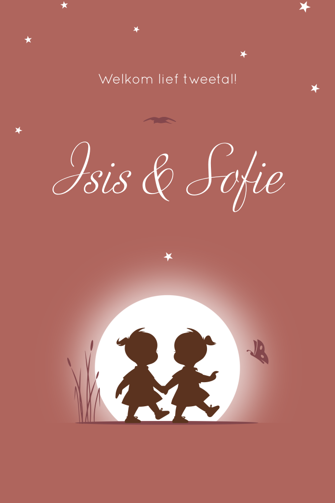 Lief geboortekaartje voor de komst van twee meisjes. Mooi ontwerp met in silhouet een meisjes tweeling die hand in hand voor een ondergaande zon lopen. Extra hip door de afgeronde hoeken.