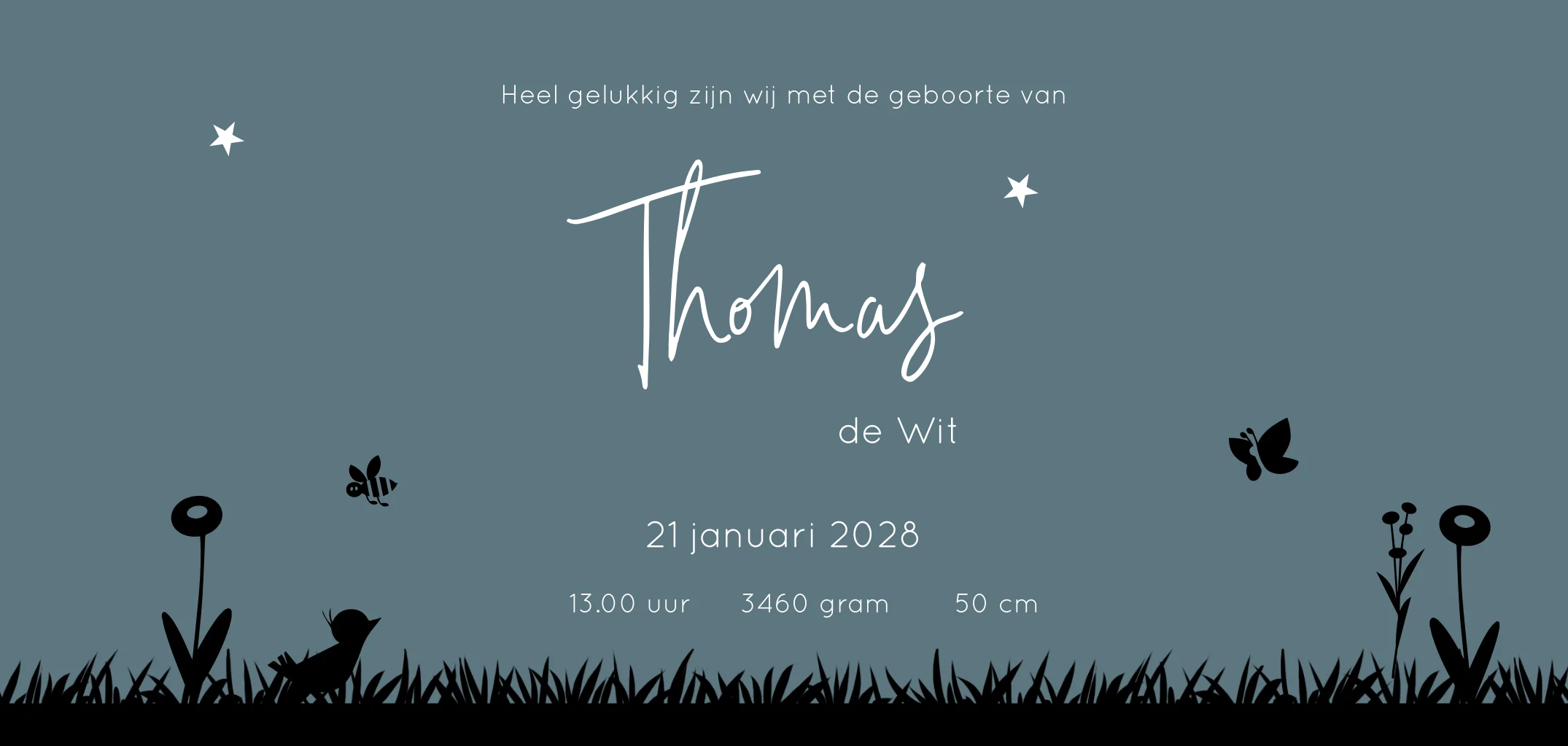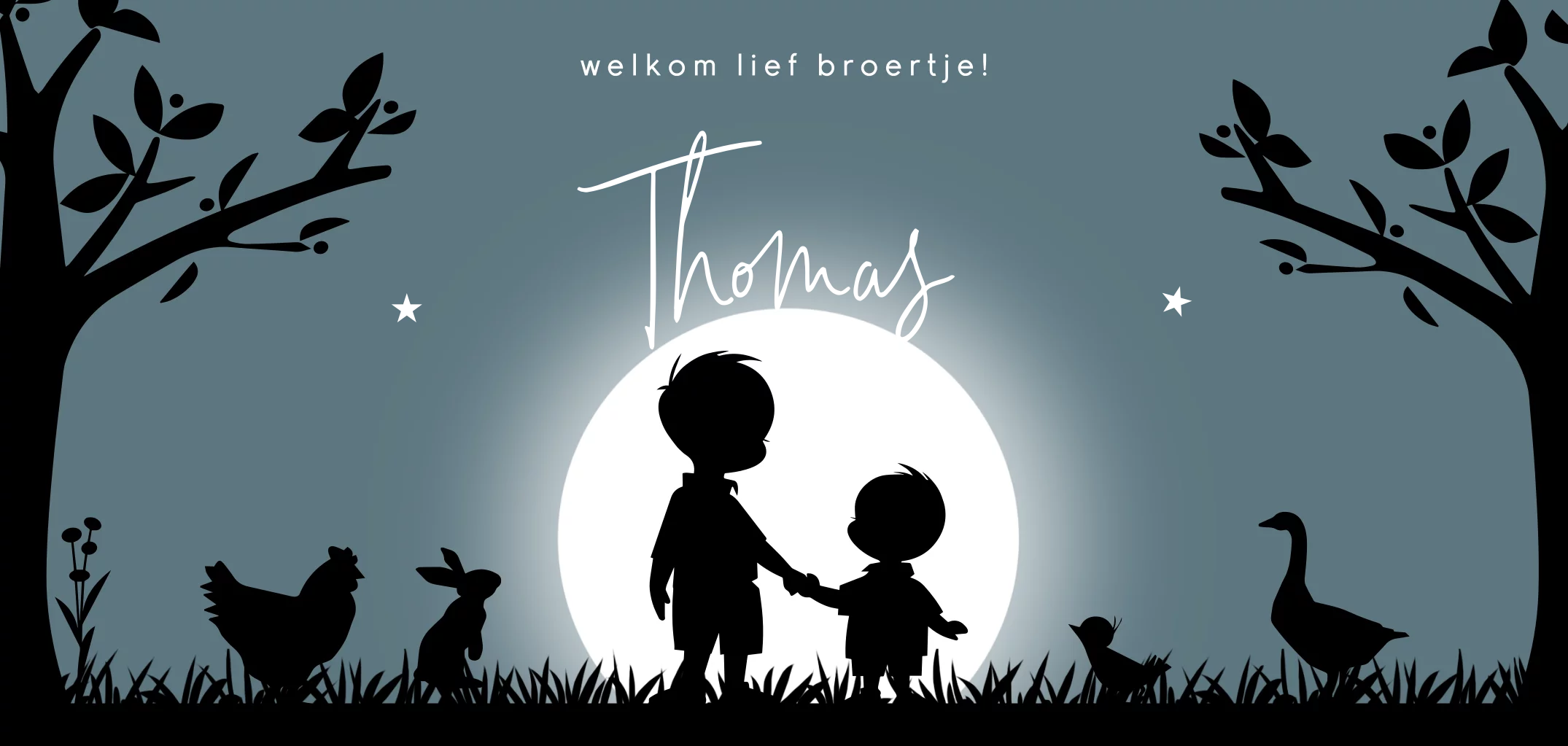 Prachtig geboortekaartje voor een tweede kindje. Twee broertjes staan in het gras voor een ondergaande zon. Om hen heen dieren, bomen en planten. In de lucht sterren in goudfolie, en ook de naam van het jongetje is in koperfolie gedrukt. Aan de binnenkant van het kaartje is alle ruimte voor de geboortegegevens.