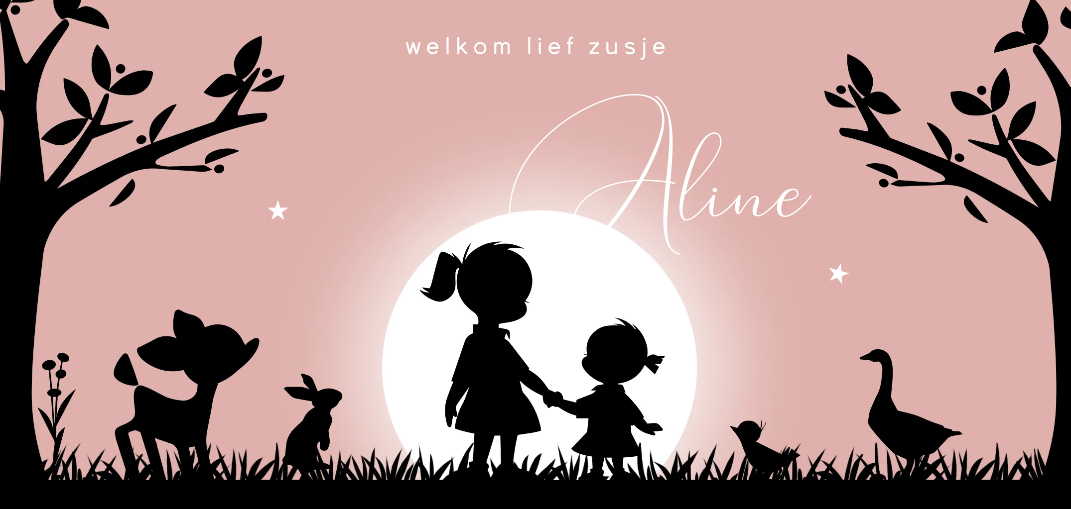 Prachtig geboortekaartje voor een tweede kindje. Twee zusjes staan in het gras voor een ondergaande zon.Om hen heen dieren, bomen en planten. In de lucht sterren in koperfolie, en ook de naam van het meisje is in koperfolie gedrukt. Aan de binnenkant van het kaartje is alle ruimte voor de geboortegegevens.