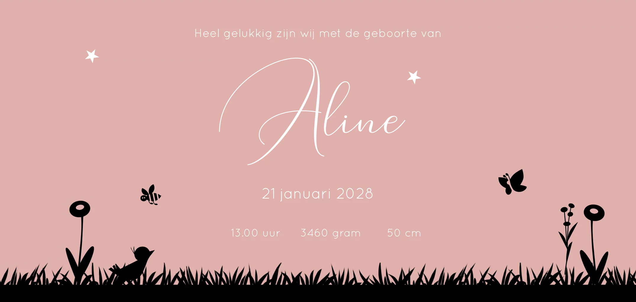 Prachtig geboortekaartje voor een tweede kindje. Twee zusjes staan in het gras voor een ondergaande zon.Om hen heen dieren, bomen en planten. In de lucht sterren in koperfolie, en ook de naam van het meisje is in goudfolie gedrukt. Aan de binnenkant van het kaartje is alle ruimte voor de geboortegegevens.