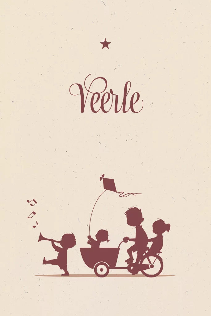 Lief geboortekaartje met afgeronde hoeken. In een bakfiets zie je een klein meisje dat een vlieger vasthoudt. Haar grote broertjes en zusje rijden met haar mee. Je kunt dit kaartje zo aanpassen dat het matcht met jouw eigen gezinssamenstelling. Kijk hiervoor bij "Afbeeldingen en versieringen".