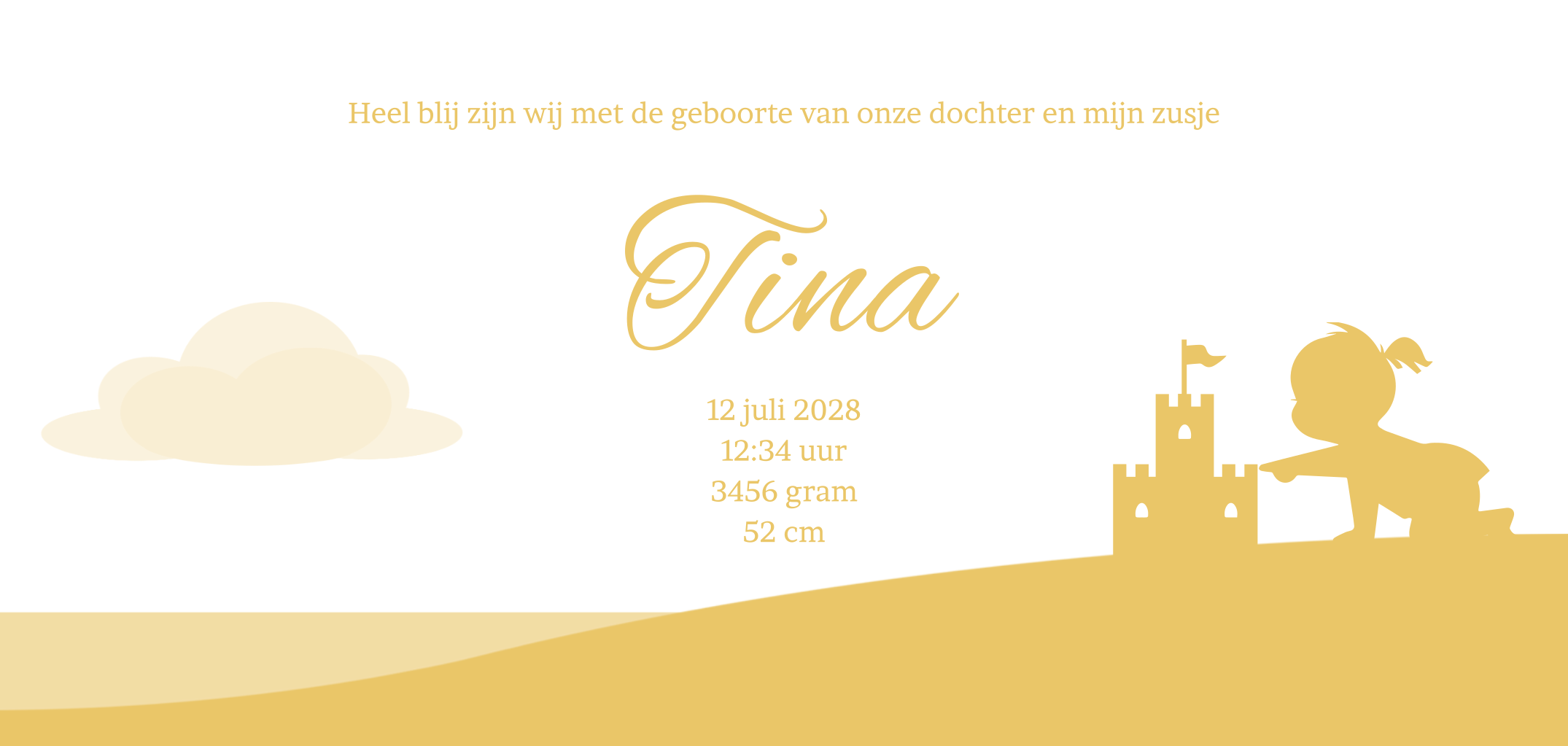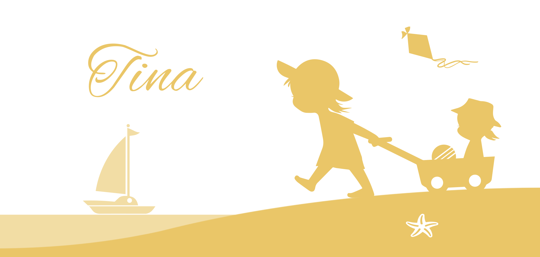 Verwacht je deze zomer een tweede kindje? Dan is dit strand geboortekaartje perfect! Vrolijke silhouet tekening met een grote zus dat in een bolderkar haar kleine zusje meeneemt. Verder een vlieger in de lucht, een zeilboot in de zee, een vuurtoren met duingras in de verte. Een echt Hollands kaartje!