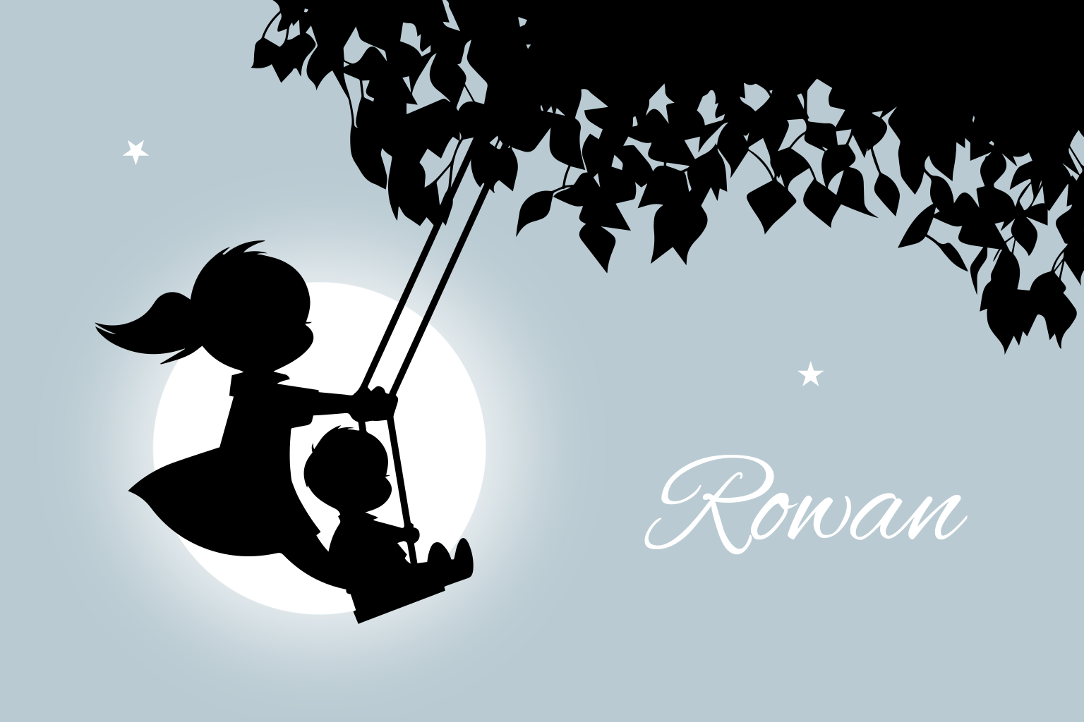 Geboortekaartje met het silhouet van een grote zus met haar baby broertje op een schommel. Aan de binnenkant vliegen twee vogels met op de achtergrond een stralende zon. Je kunt dit kaartje aanpassen naar je eigen gezinssamenstelling. Aan de binnenkant is alle ruimte voor de geboortegegevens van jouw kind.