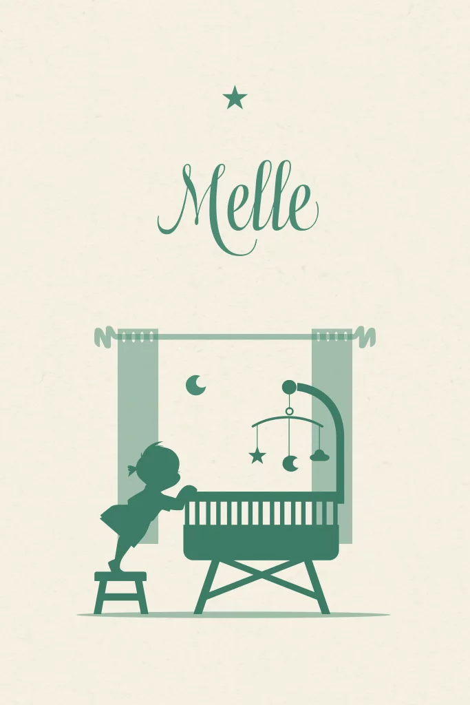 Geboortekaartje voor de komst van een tweede kindje met grote zus en baby jongen. Ontwerp met silhouet waarop een meisje op een krukje staat en de wieg in kijkt waar haar kleine broertje in ligt te slapen. Je kunt de kleuren zelf nog aanpassen.