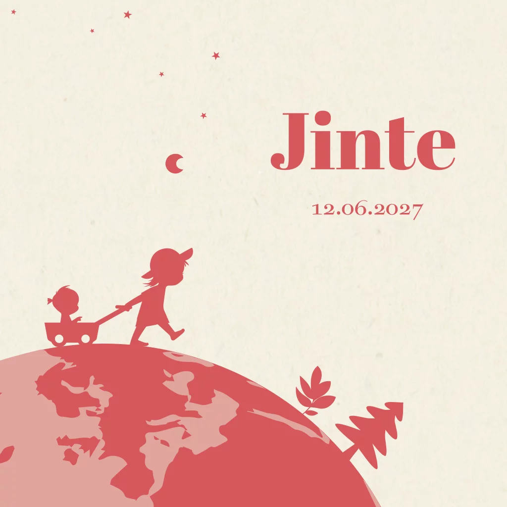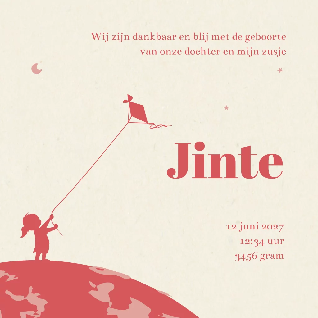 Vierkant dubbel geboortekaartje met afgeronde hoeken voor een 2e kindje in rood. Op het kaartje zie je twee meisjes over de wereldbol lopen. Achterop een zeilbootje. Je ziet sterren en een maan in de lucht en een zachte achtergrond die het helemaal af maakt.