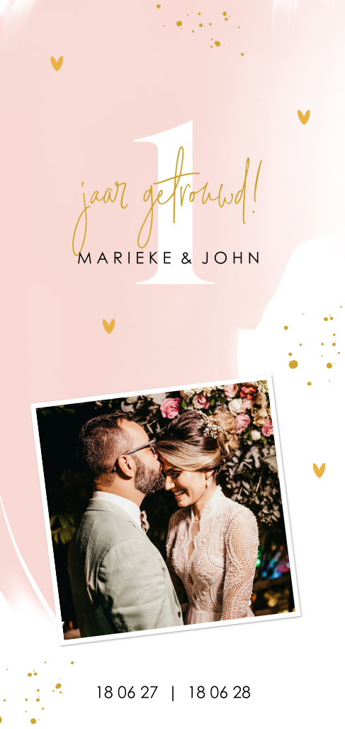 Willen jullie het 1-jarige jubileum graag groots vieren? Dan is een bijpassende uitnodiging wel zo leuk. Deze romantische uitnodiging heeft zachtroze verf als achtergrond en is versierd met goudkleurige spetters en hartjes. In het witte kader kun je een mooie foto van jullie tijdens de bruiloft plaatsen. Op de achterzijde is ruimte voor het programma van de jubileum avond en kun je een eventuele dresscode en cadeautip kwijt.