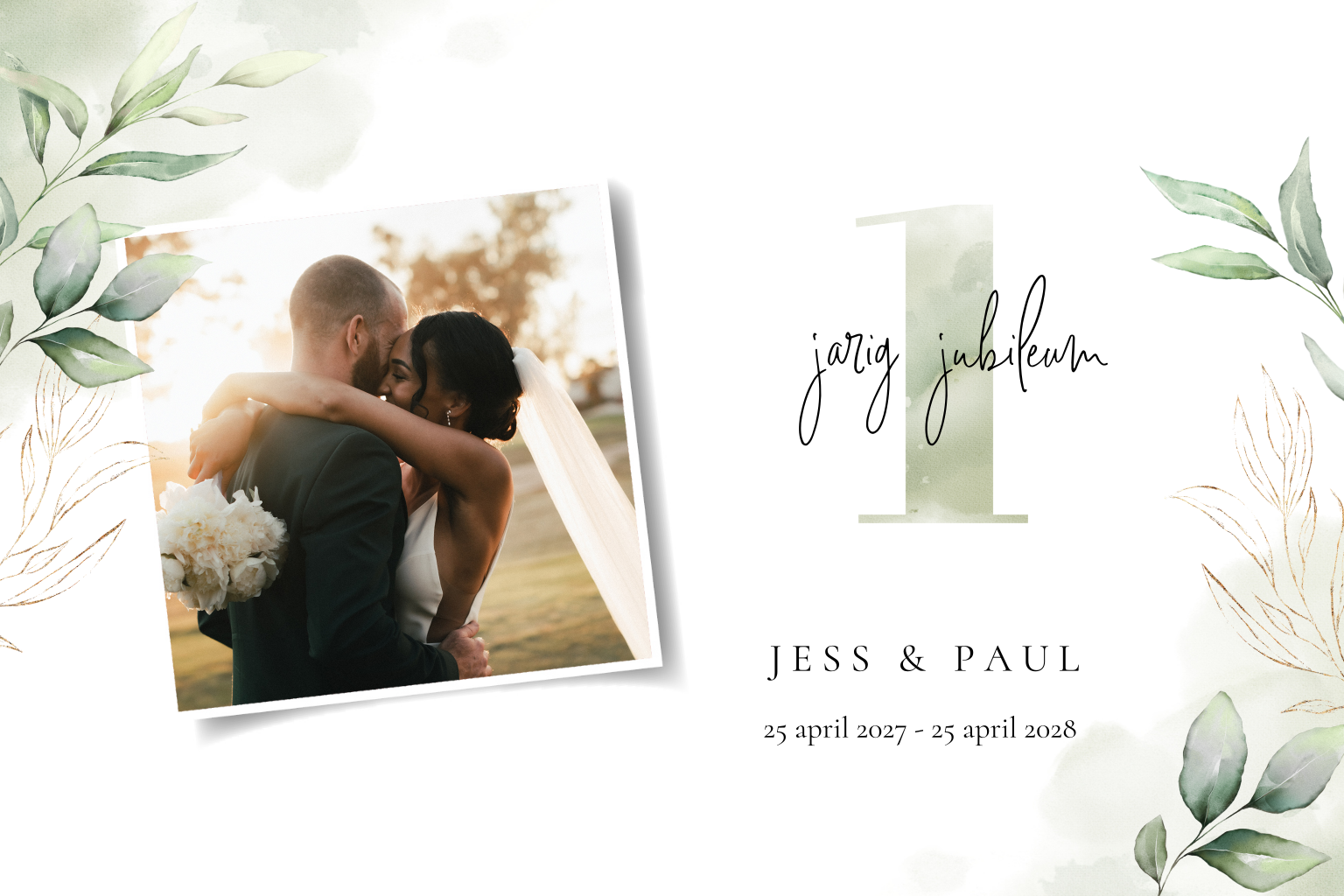 Ben jij vorig jaar getrouwd en heb je dat door de omstandigheden klein moeten vieren. Vier dan tijdens jullie 1-jarige jubileum alsnog een feestjes met je vrienden en familie. Deze uitnodiging is versierd met groene waterverf, subtiel geschilderde takjes en goudkleurige bladeren. In het midden staat een groene 1 en jullie namen. In het witte fotokader kun je een mooie foto kwijt van jullie bruiloft. Pas het ontwerp naar wens aan en bestel een drukproef.