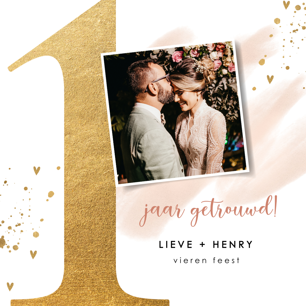 Zijn jullie onlangs 1 jaar getrouwd? Met deze kaart kun je vrienden en familie uitnodigen voor een groot feest tijdens jullie 1-jarig jubileum. In het witte fotokader is ruimte voor een foto van jullie bsamen. De kaart is versierd met goudkleurige spetters en hartjes en in het midden staat een groot cijfer 1. Bestel een drukproef om de kaart eerst in het echt te beoordelen.
